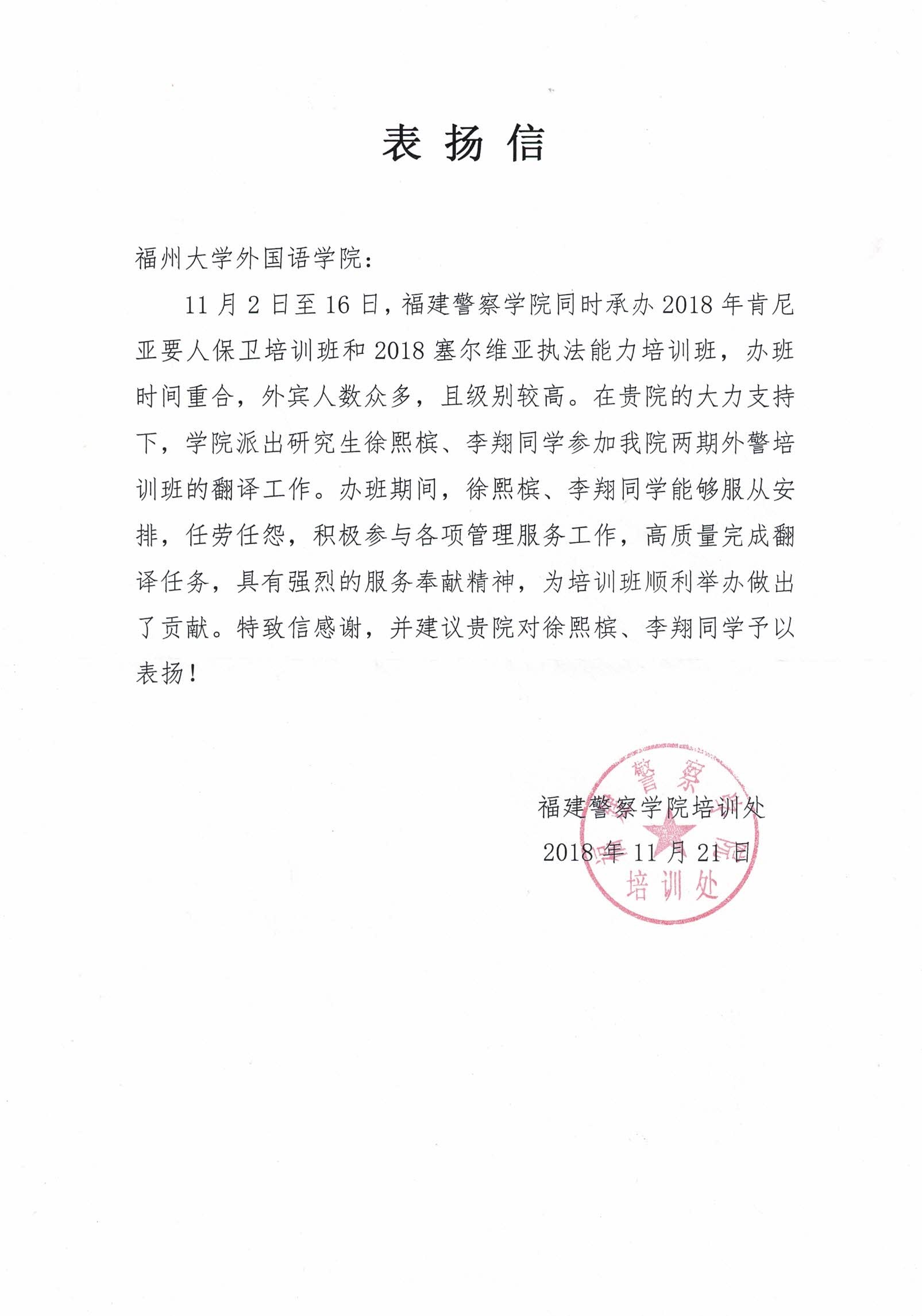在此期间,李翔与徐熙檳两位同学服从安排,任劳任怨,积极参与各项管理服务工作,高质量完成翻译任务,其出色的工作表现受到福建警察学院领导和参训学员的一致肯定,展现了电影天堂