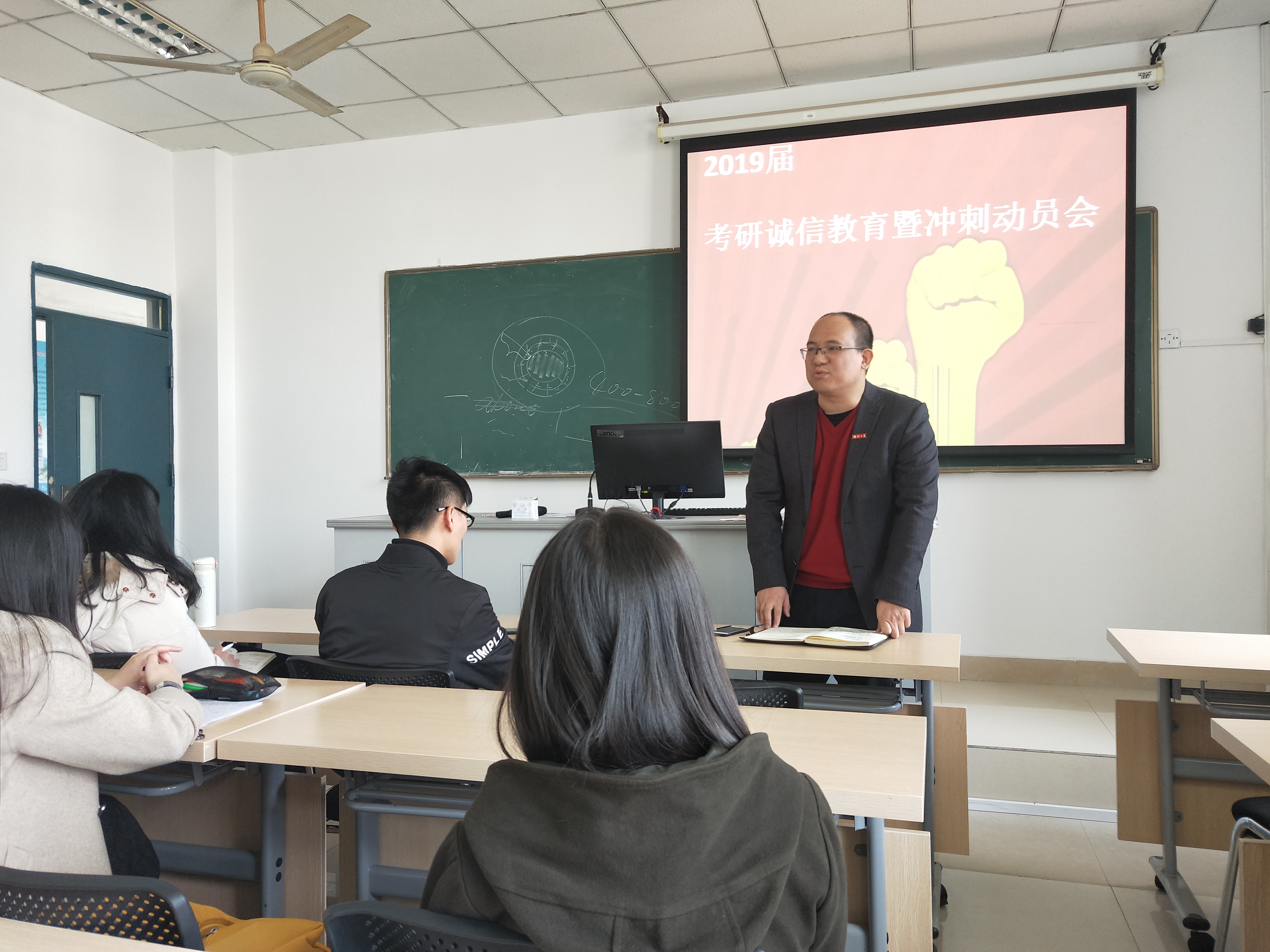 2019届考研诚信教育暨冲刺动员会在院办教学楼405室顺利展开,院党委副书记王三强、副院长钟晓文出席大会。