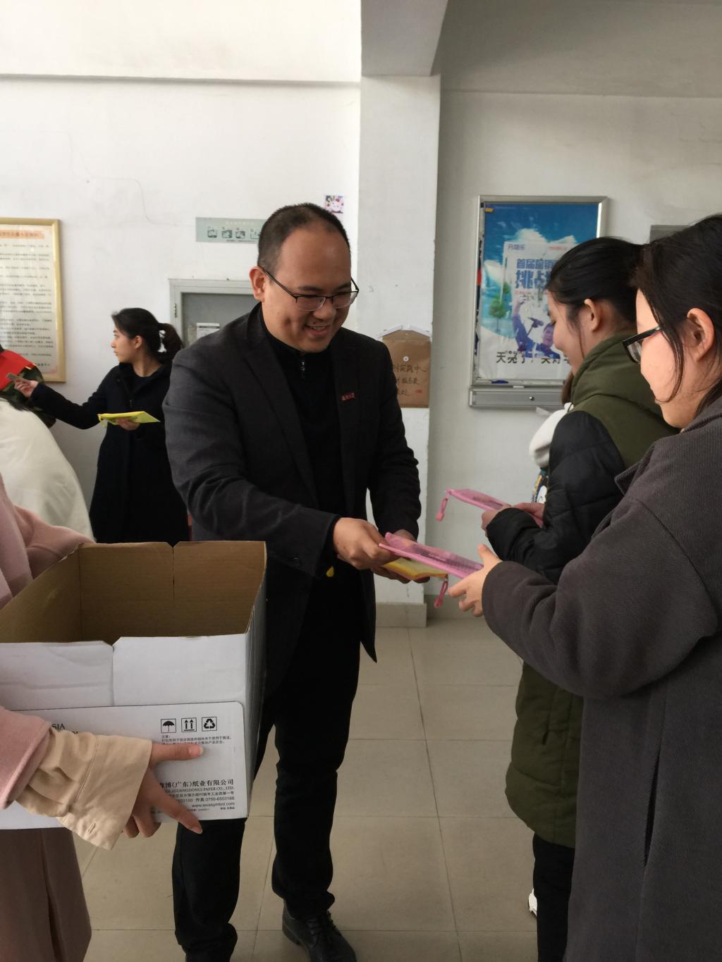 图为王三强副书记正在为考研备考学生发放文具套装。