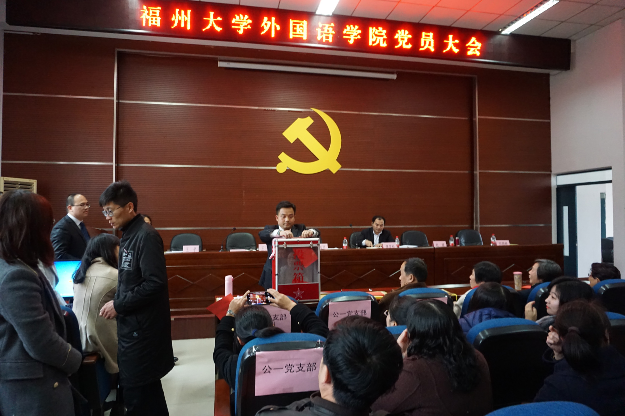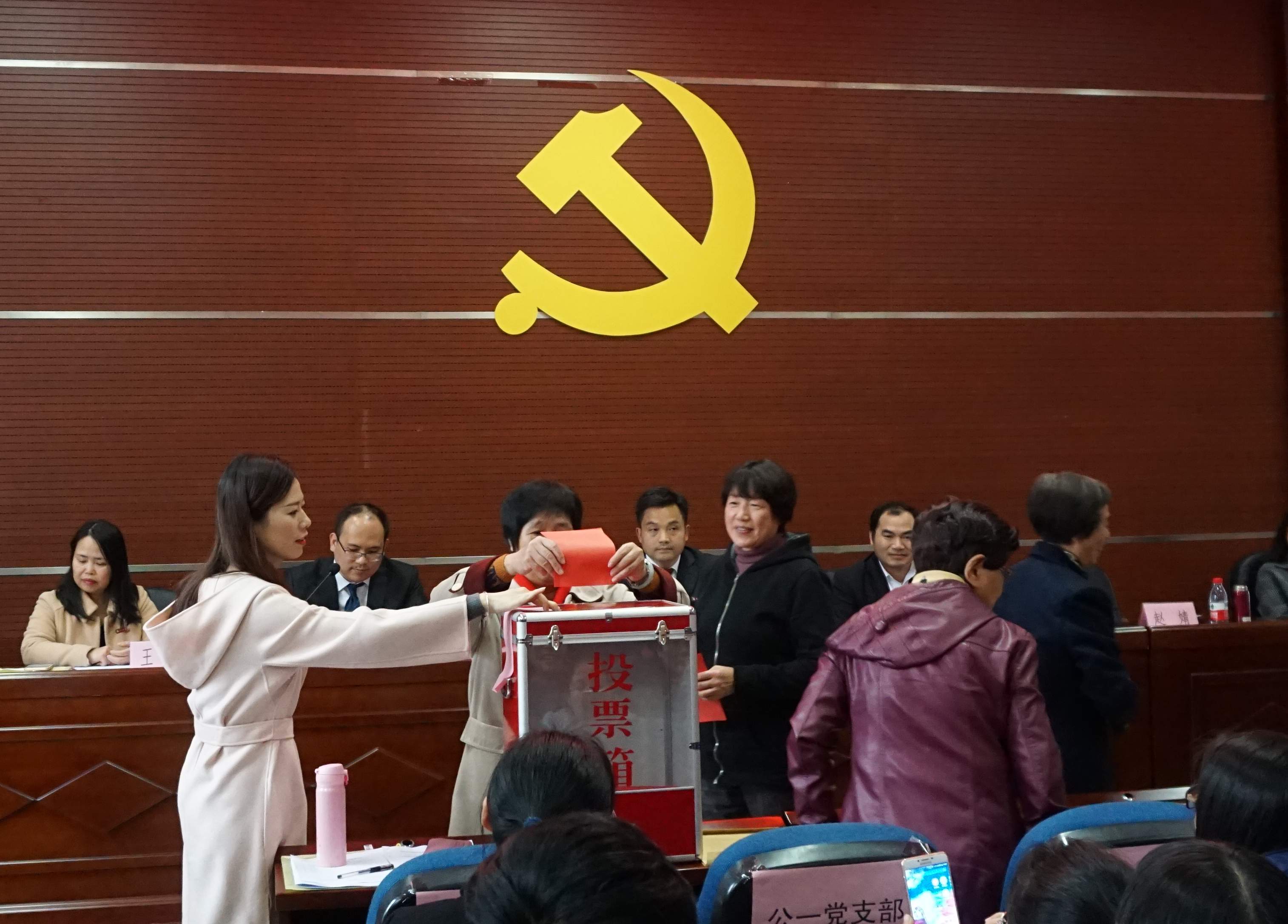 委员会换届选举办法(草案)》及新一届党委委员选举总监票人、监票人、总计票人、计票人建议人员名单。大会通过了学院新一届党委委员候选人名单,并以无记名投票的方式选举产生了王平、王三强、李权、陈伟民、林继红、郑颖峰、钟晓文等七位同志为学院新一届党委委员。大会在雄壮的《国际歌》中顺利闭幕。