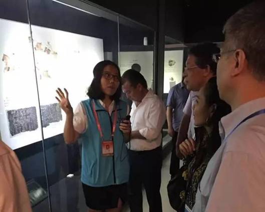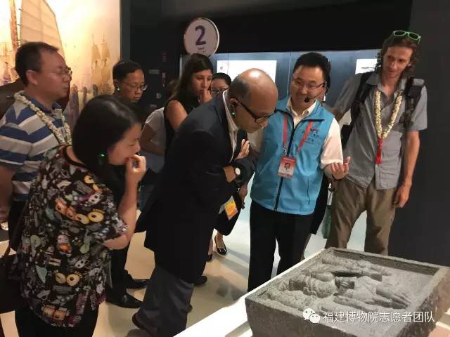 在讲解现场,志愿者团队为来宾们介绍了海上丝绸之路和福建古代文明之光展厅。杨首晖引用了孔子的《论语》作为讲解的开场白 :It is such a delight to have friends coming from afar(有朋自远方来,不亦乐乎)。福建的海洋文化可以追溯到4千年以前,福建先民乘着小舟,劈波斩浪,驶向广阔的太平洋。三国时期,福建开始建造船只,海上丝绸之路自此联结世界,在宋元时期达到了巅峰。这条海丝之路,不只是丝绸、瓷器、茶叶的贸易,更是各国思想、文化、信仰的交流。他作了一个形象的比喻,海丝就像是Internet of antiquity(古代的互联网)。