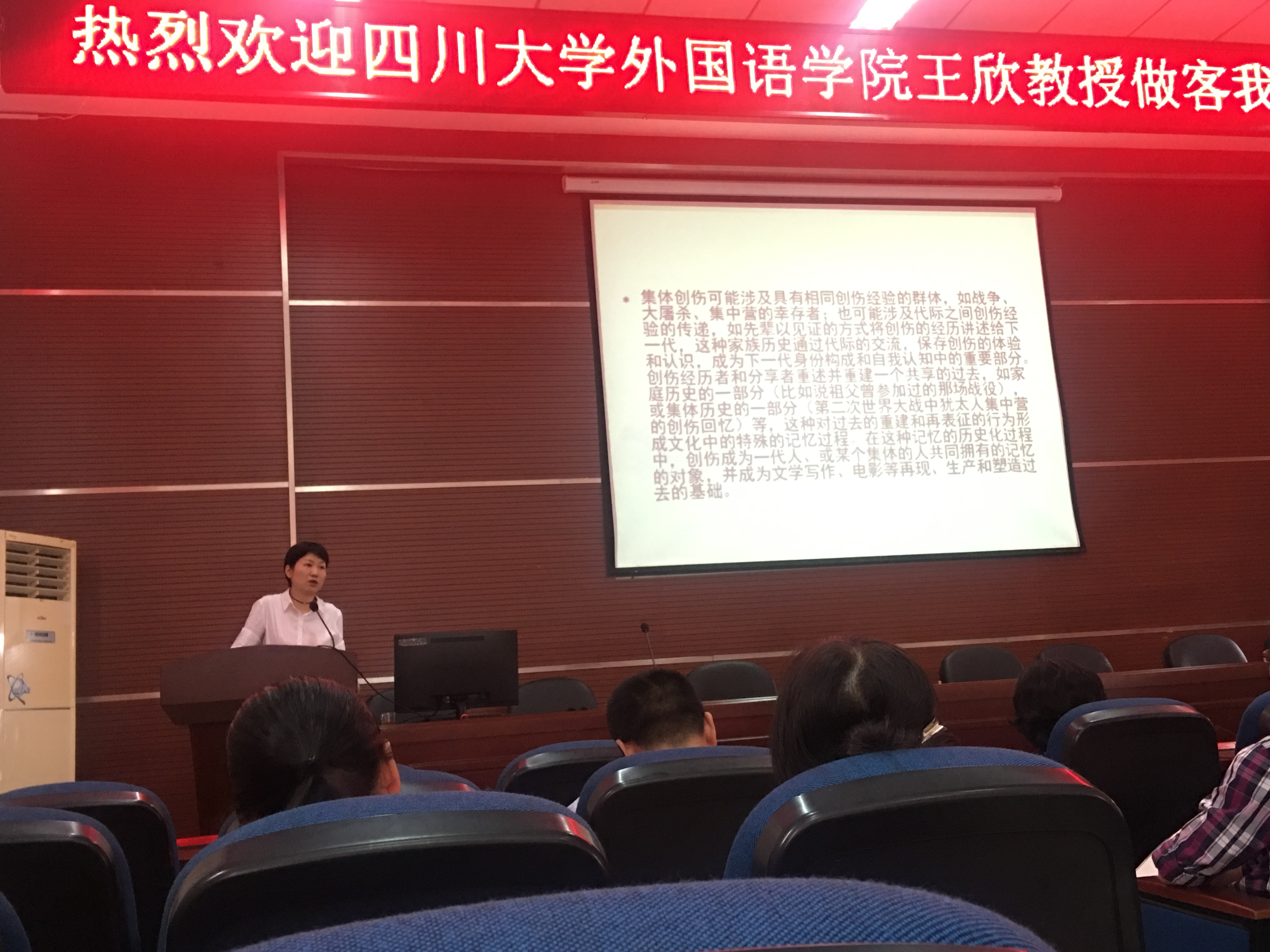 英文系主任、教育部区域与国别研究培育基地四川大学美国研究中心副主任,主要研究领域为西方文论与英美文学。在今天的讲座中,王欣教授以“文学中的创伤心理和创伤记忆”为题开讲。