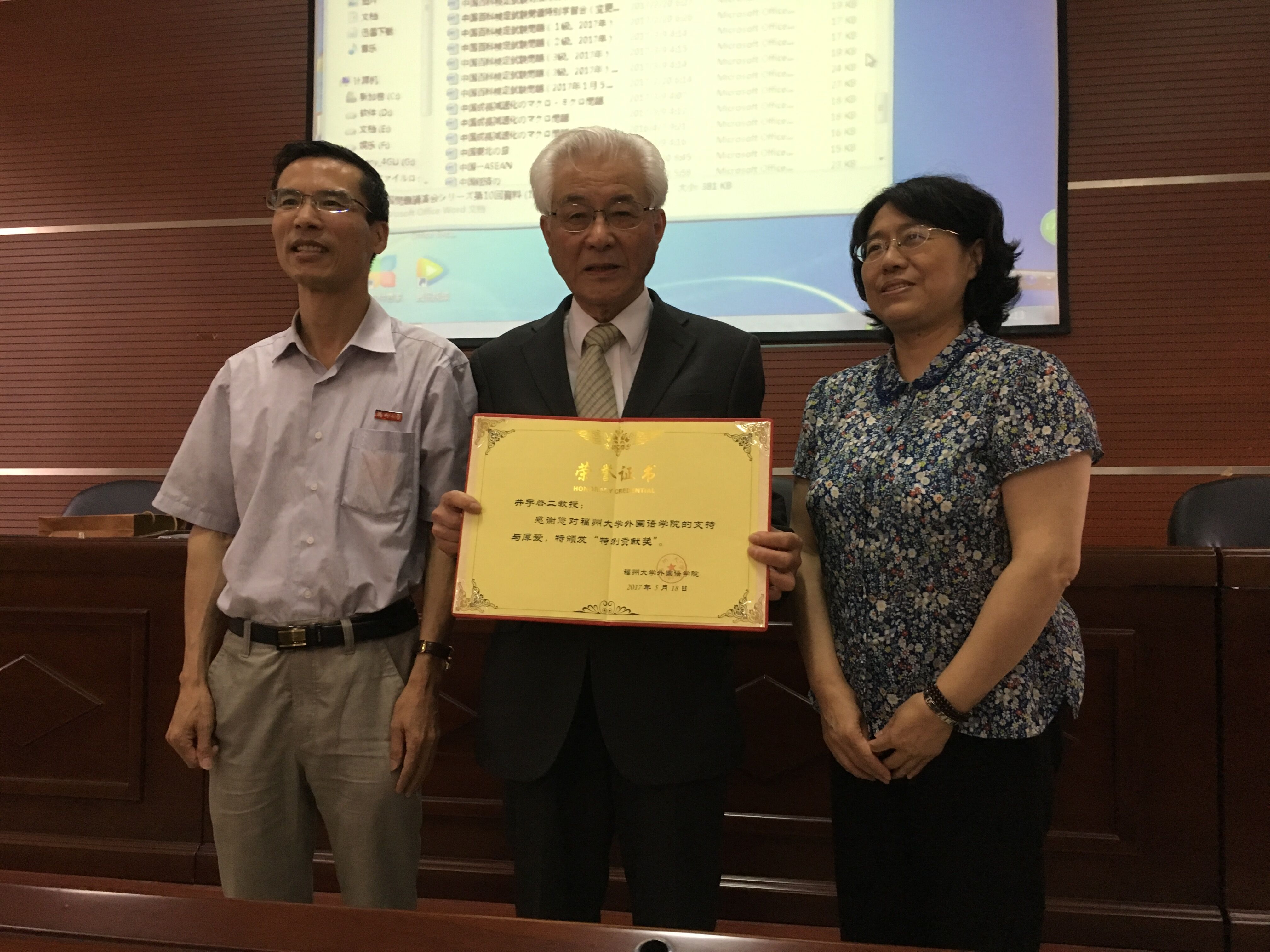 在讲座开始前,院党委书记倪朝兴书记和潘红院长上台为井手教授颁发“特别贡献奖”的荣誉证书,感谢井手教授为电影天堂