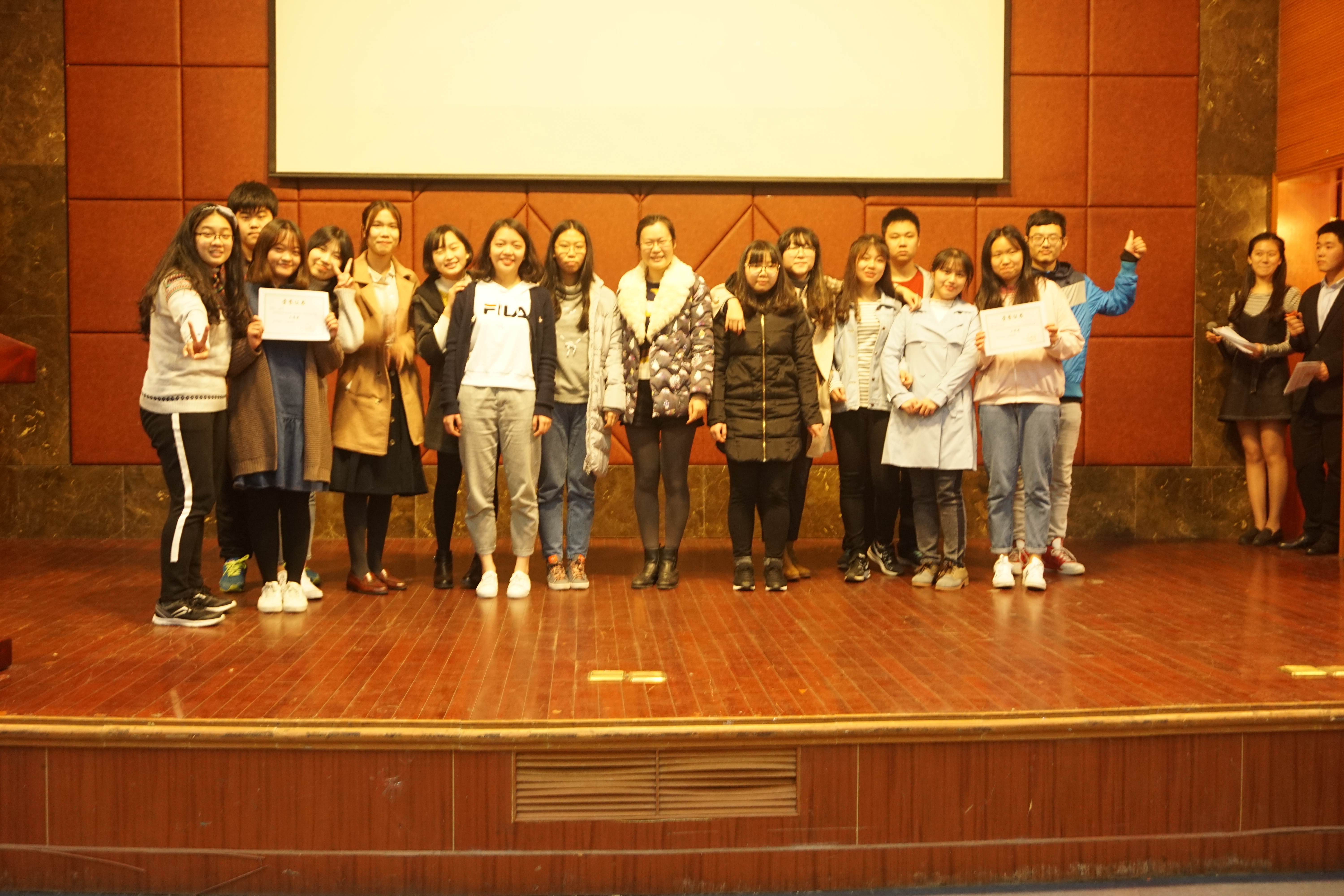 经过评委老师的认真审核、打分后,最终,英语二班的《妙子》荣获一等奖;德语班、日语班获得二等奖;英语一班、英语三班获得三等奖。此次大赛还评选出了“最佳男女主角”、“最佳编剧”、“最佳导演”、“最佳旁白”并授予奖状。