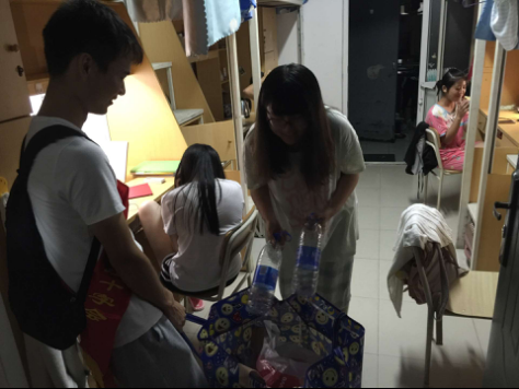 红十在学生宿舍楼13#面向本栋楼的外院女生开展废品及旧衣物回收活动。