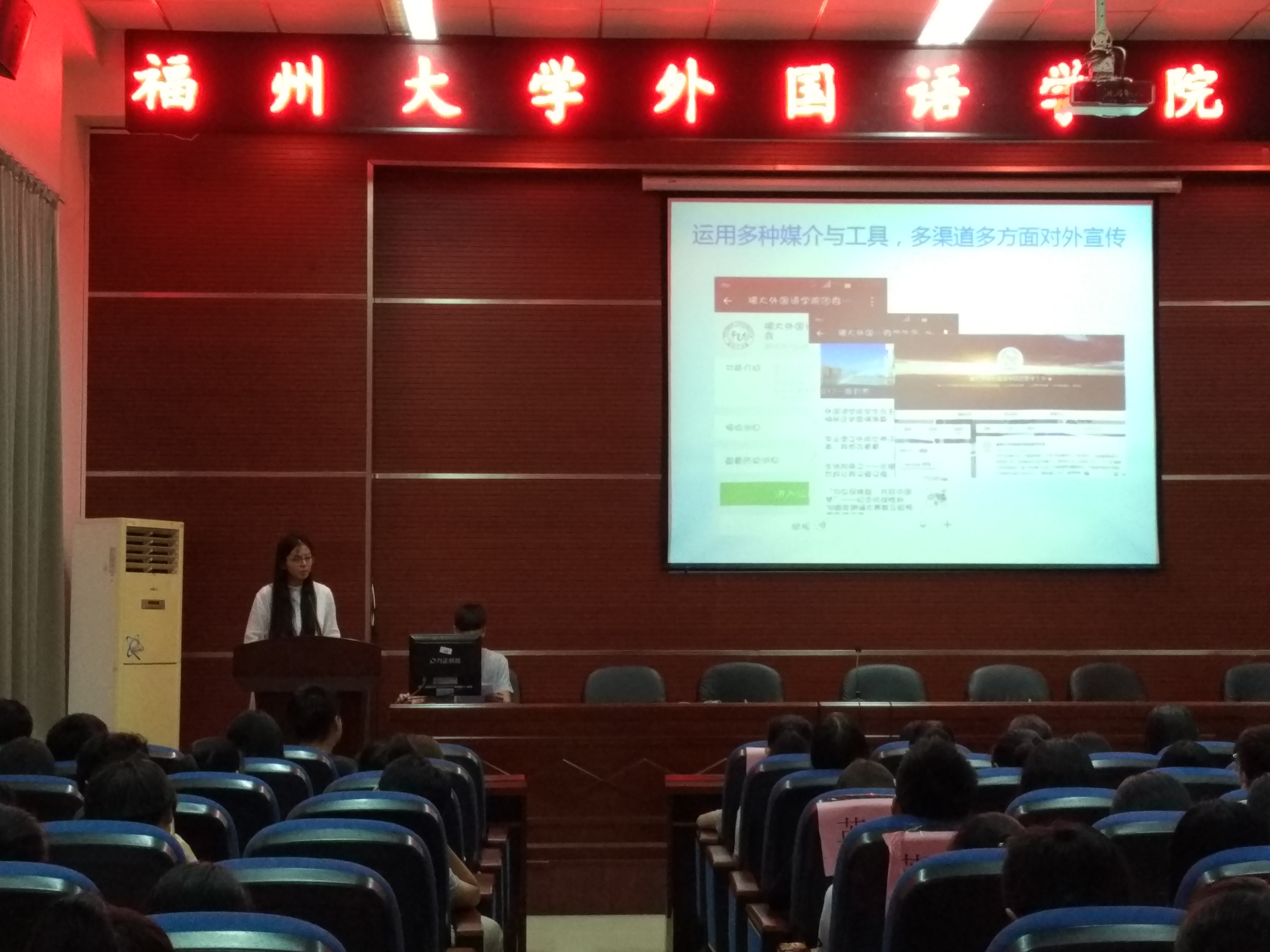 晚7时许,宣讲会开始,外院文化部、学术部以及体育部等19个部门的代表按照宣讲会前抽签的顺序依次上台对各自的部门作出精彩的宣讲。各宣讲人都细致介绍了其所在部门的主要职能、精品活动及发展规划,让同学们对学生会有了一个更加全面、系统、具体的了解,在演示文稿的配合下,努力为新生勾勒出对部门的最初印象。在各部门的积极准备下,宣讲会现场气氛被一次次推向高潮,台下的新生听众们认真聆听,对每一位宣讲人都不吝啬自己的掌声。在掌声中,新生们也积极寻找合适自己的部门,听取老生们的建议选择自己最热爱的工作,并期待着在未来能为部门、团委学生会乃至外国语学院创造出更多的精彩。宣讲会一直持续到晚九点半左右。