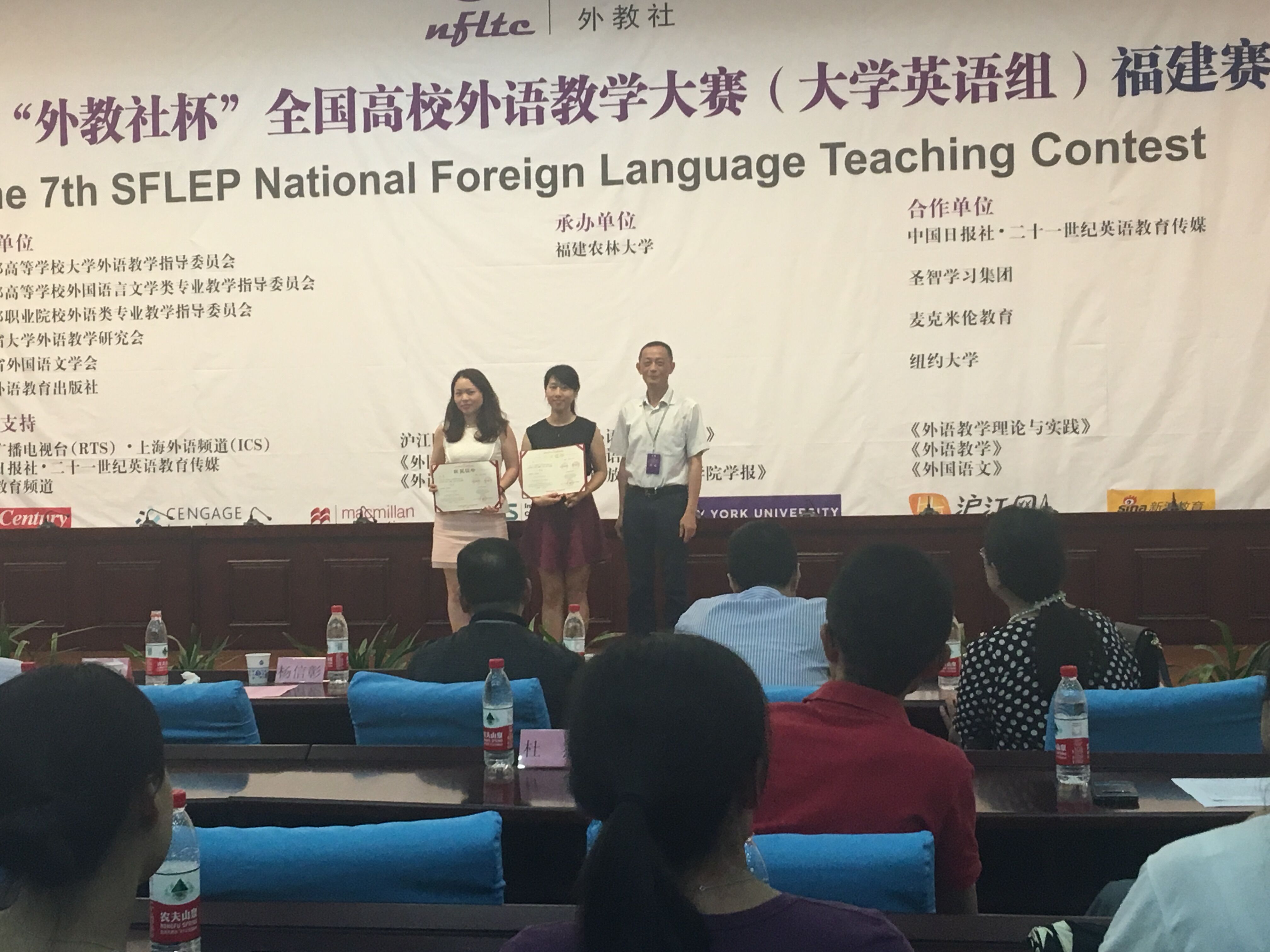 2016年6月3--5日,第七届“外教社杯”全国高校外语教学大赛福建赛区的比赛(大学英语组)在福建农林大学文法学院举行,电影天堂 绳薇老师和张双江老师以清晰的逻辑,标准的语音,流畅的表达及精彩的课堂互动赢得了评委老师们的一致认可,从福建赛区总决赛中脱颖而出。经过激烈的角逐,绳薇老师获得福建赛区“视听说组”一等奖,张双江老师获得“综合组”三等奖。感谢指导老师对本赛事的指导和参赛老师的付出! (王平报道)