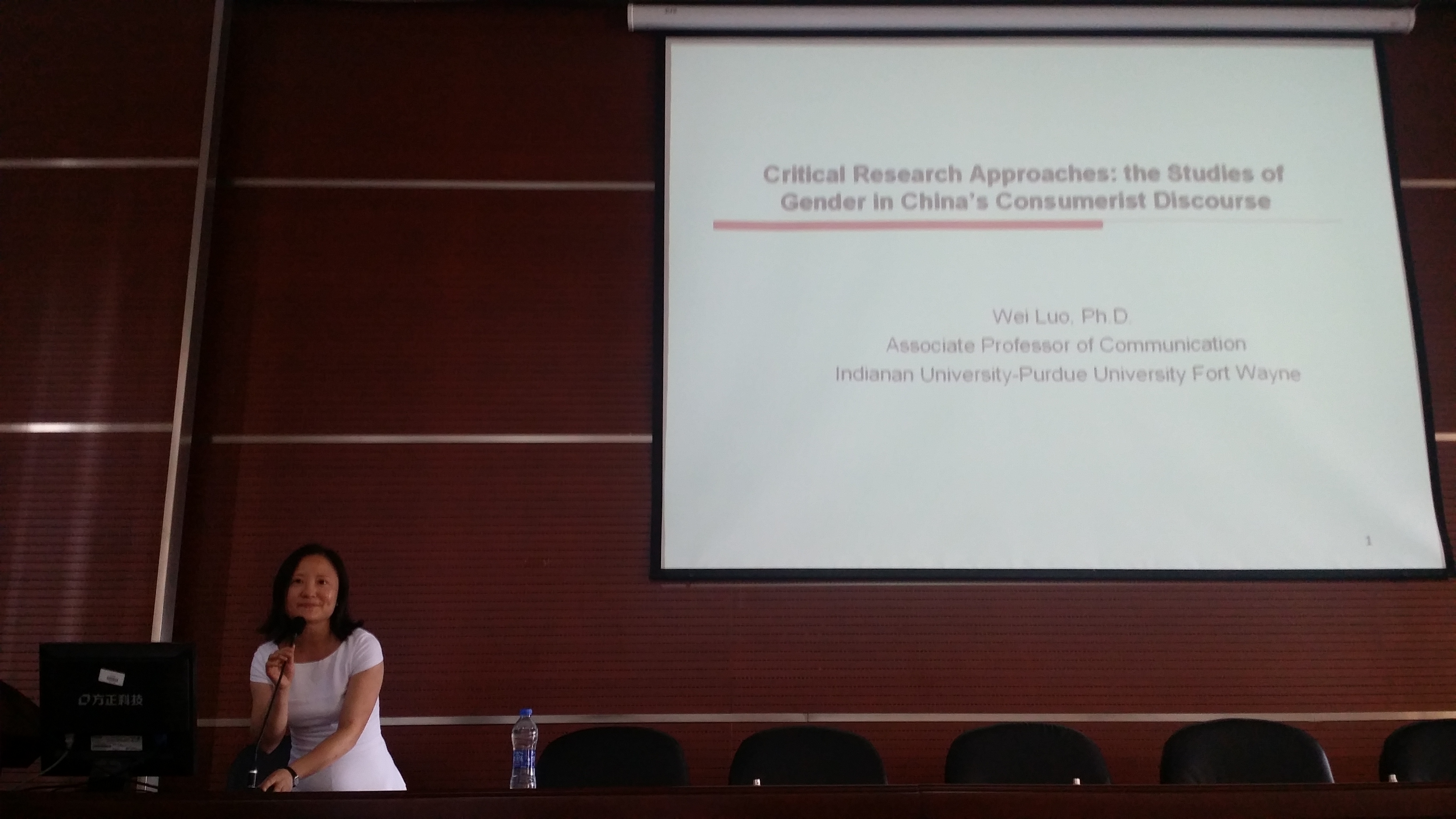 英语系。2002年,2008年分别获尤他大学英语硕士、传播学博士学位。主要研究方向:传媒,中国女性,女权,消费主义与跨文化传播。目前致力研究中国市场经济深化改革下的男女身份、阶层、民族等社会构建中出现的问题。在今天的讲座中,罗蔚博士阐述了源于西方学术界的批评性理论与研究方法论,包括: 批评修辞学、批评民族志、符号学及批评性语篇分析,并以自己的论文为实例,探讨批评性方法在研究中国消费主义语篇及身份构建问题中的运用。具体实例包括对女性身体、整容消费、婚恋媒体中现代新娘形象以及 “非诚勿扰”相亲节目的解读和分析。