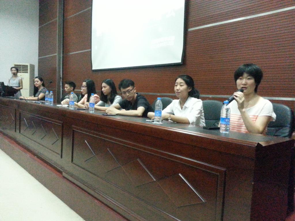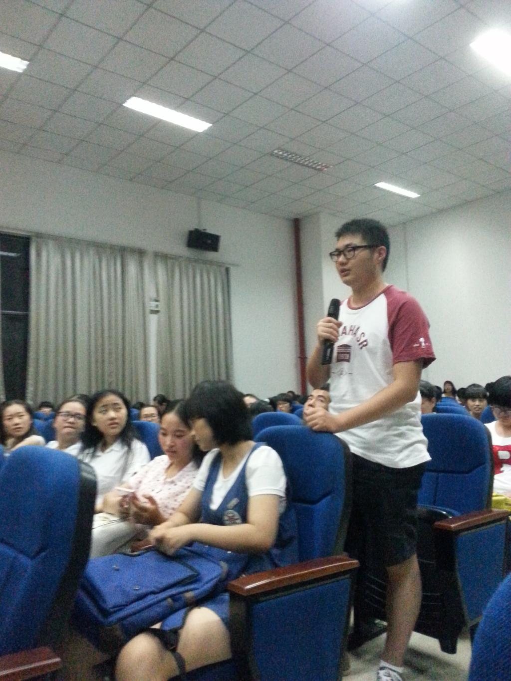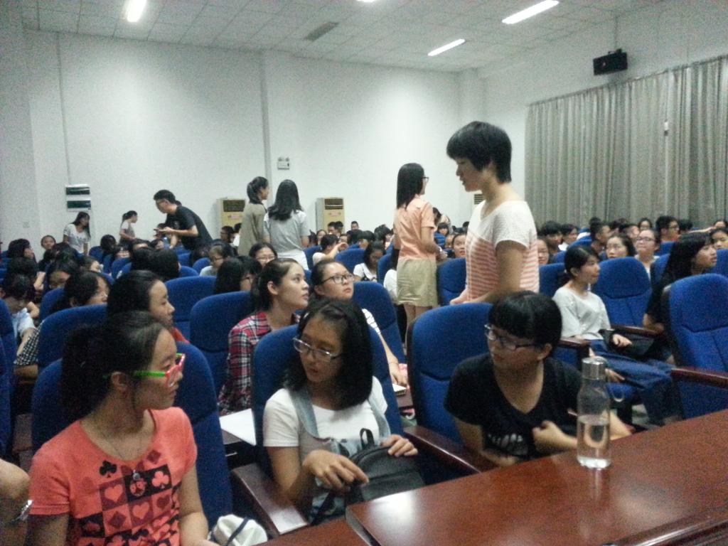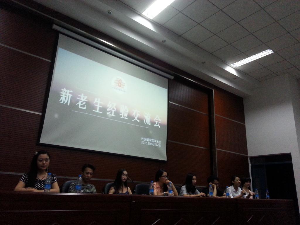 团委学生会主席白雅佳、上一届学生会副主席陈捷、姜晓敏以及参与暑期社会实践三下乡活动的部分同学、出国留学返校的学生代表,他们依次与2015级新同学们分享他们在大学的学习、工作、生活等方面的经验,也分享了他们在暑期实践和出国求学期间的见闻。学生代表们以幽默风趣、平易近人的语言讲述着自己的经历,也给新生们提供了许多建议。同时,会议中也有新生问答、学生代表下台与新生们自由交流等环节,现场气氛格外活跃。