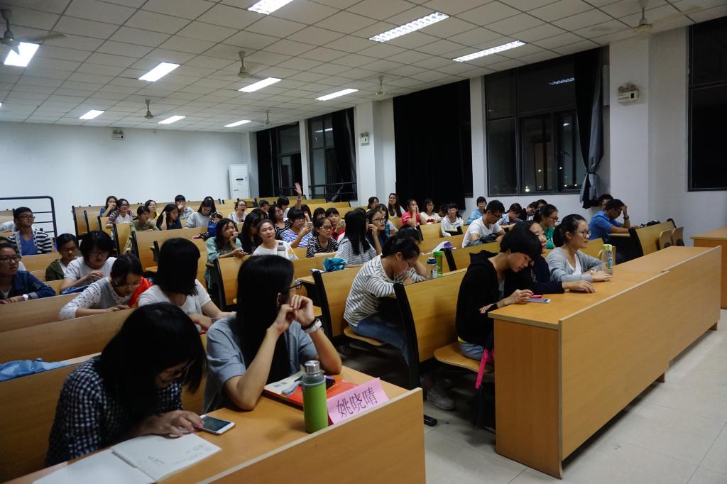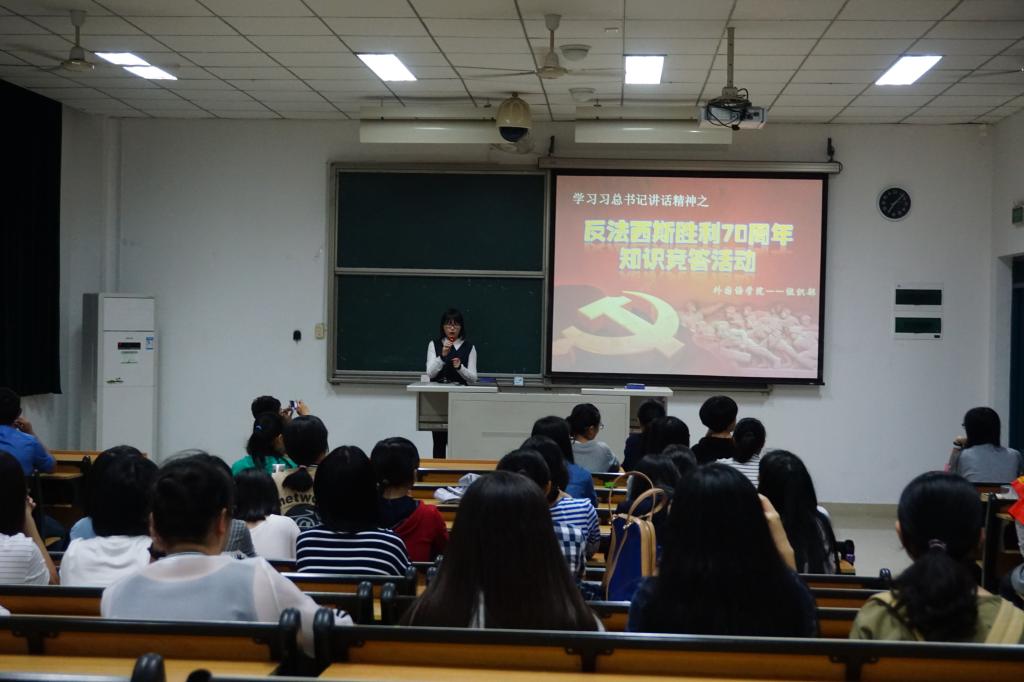 比赛当晚适逢绵绵细雨,路上湿滑,但是依旧阻挡不了参赛同学们的热情。在主持人简短的介绍后,参赛同学们认真观看阅兵视频并且积极投入到必答问题中,在问答以及抢答环节,参赛同学更是全力以赴,以最快速度拨打屏幕热线。最后日语班以抢答环节的优势取得第一的好成绩。