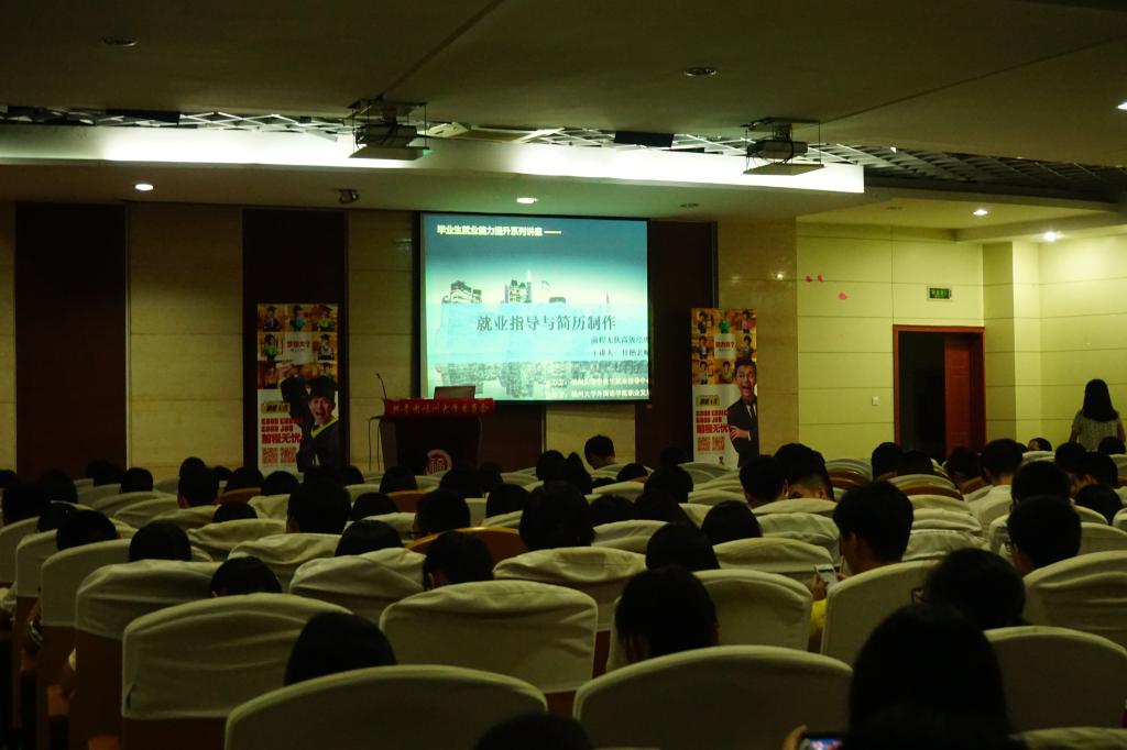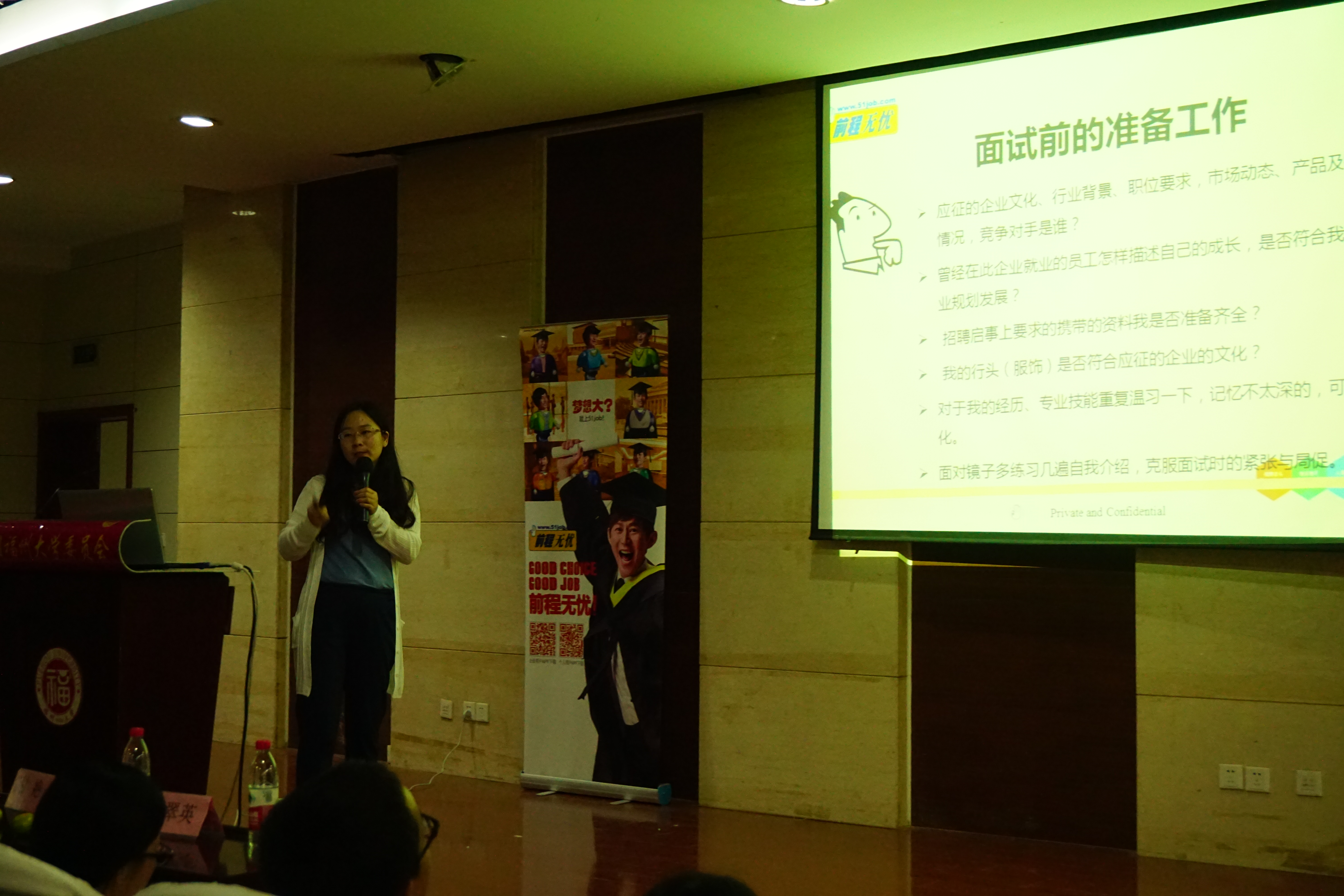 承办的就业面试指导与简历制作讲座在我校素质拓展中心学术报告厅拉开序幕。此次讲座由前程无忧的高级经理甘艳老师主讲,甘艳老师以其在人力资源从业十多年的丰富经验及对现代就业形势的缜密分析,为在场的莘莘学子答疑解惑。