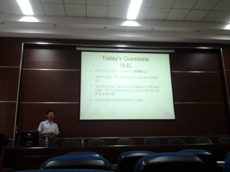 韩爱果博士首先讲述了他选取该讲座题目的缘起,并指出科学与哲学作为人的整个认知系统,是不可分割的,中国传统哲学能对人类发展带来巨大贡献。紧接着,韩爱果博士指出人类最大的问题是思维问题,科学的发展往往需要借助于哲学上的突破,他运用生活中的示例,生动地讲解了科学与哲学的联系:科学与哲学同源,科学与哲学属于同一认知系统。之后,韩爱果博士深入浅出地讲解了科学与哲学的区别,科学从一开始就是对人类认知的制约和规范,更是对人的一种不信任;而中国哲学追求的是自知、知他以及觉悟。最后,韩爱果博士重点与在场师生分享了“太极学的一知三界”;面对当今人文与科学的分离,他提醒我们要时刻谨记人文与科学是一体的。