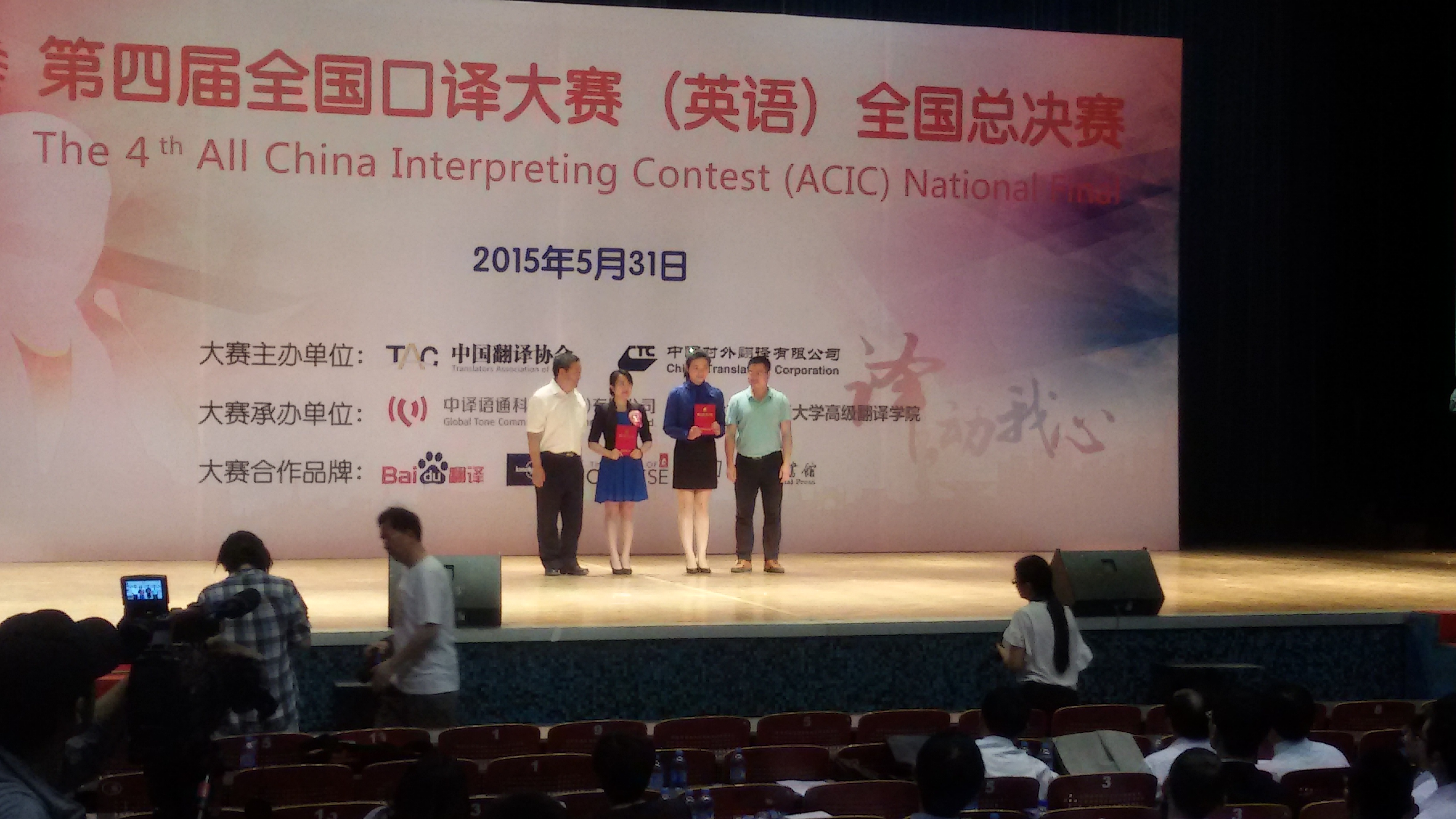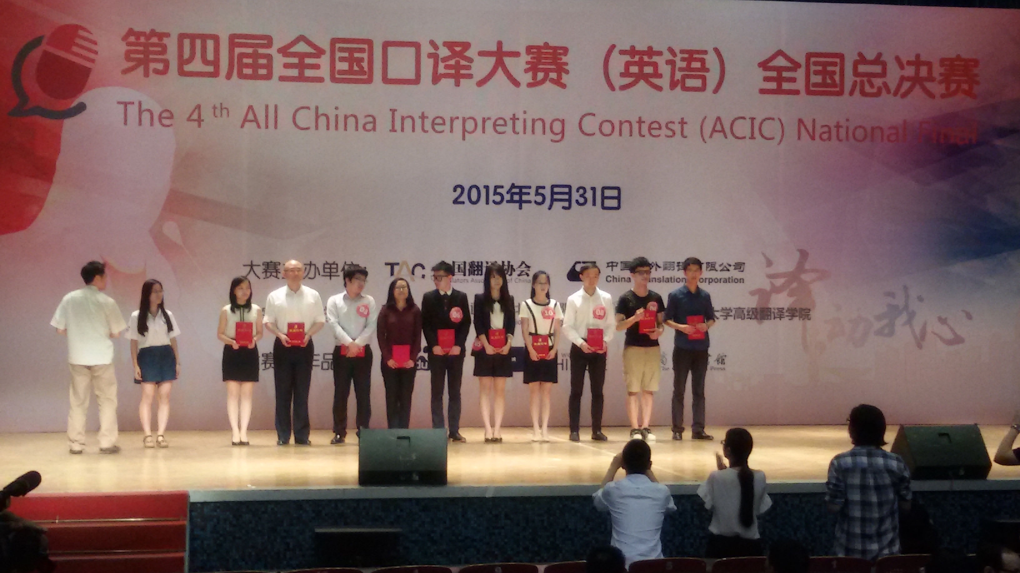 第四届全国口译大赛总决赛于2015年5月31日在北京外国语大学高级翻译学院落下帷幕。 为期5天的总决赛由交替传译、同声传译以及北外口译教学体验日等丰富多彩的活动组成。交替传译设立一等奖1名,二等奖3名,三等奖8名,其余获得优秀奖。同声传译决出一等奖1名,二等奖2名,三等奖3名,其余获得优秀奖。本届全国口译大赛还产生了最佳风采奖1名 与最佳网络人气奖3名(由网络评选产生)。