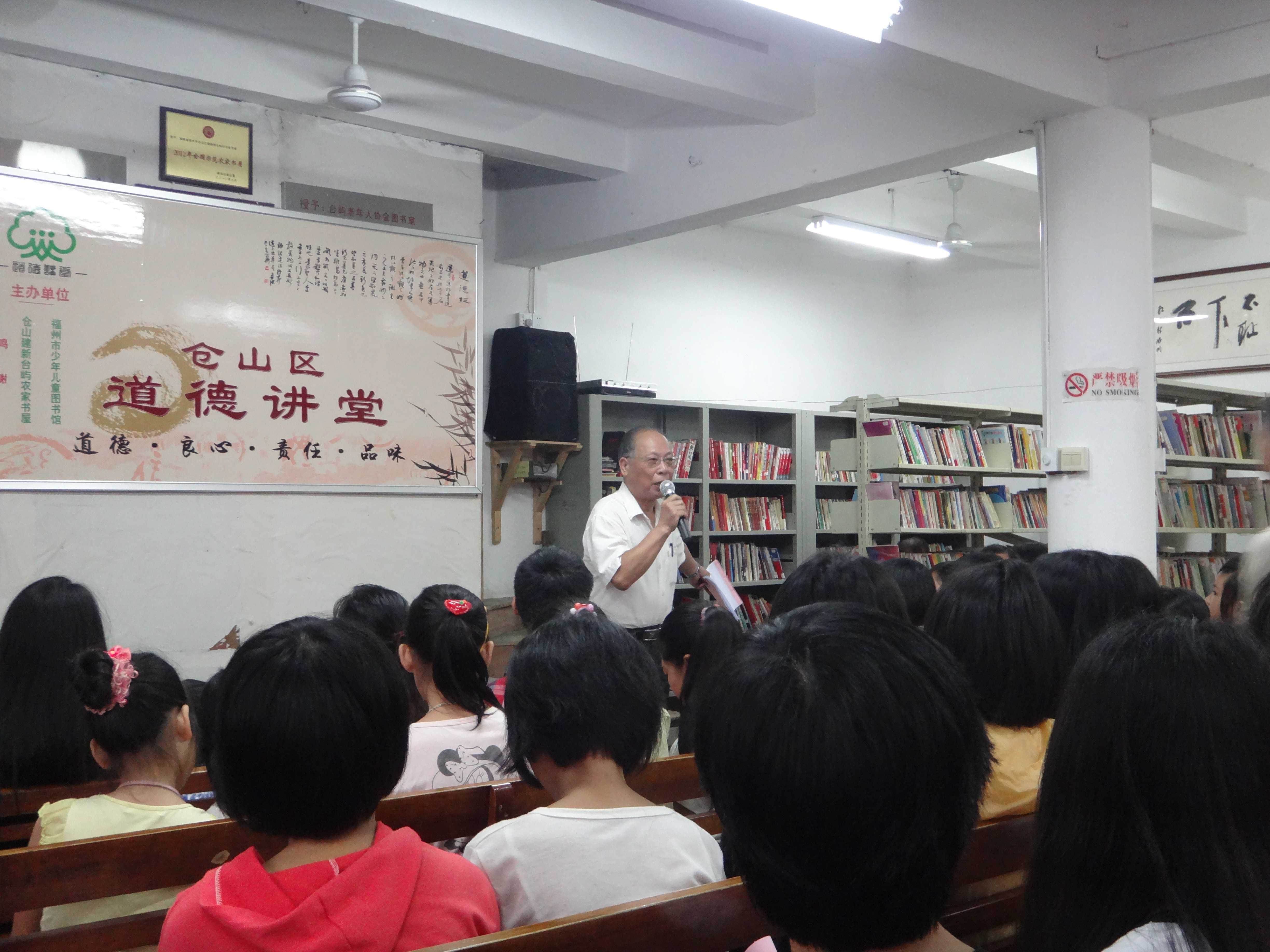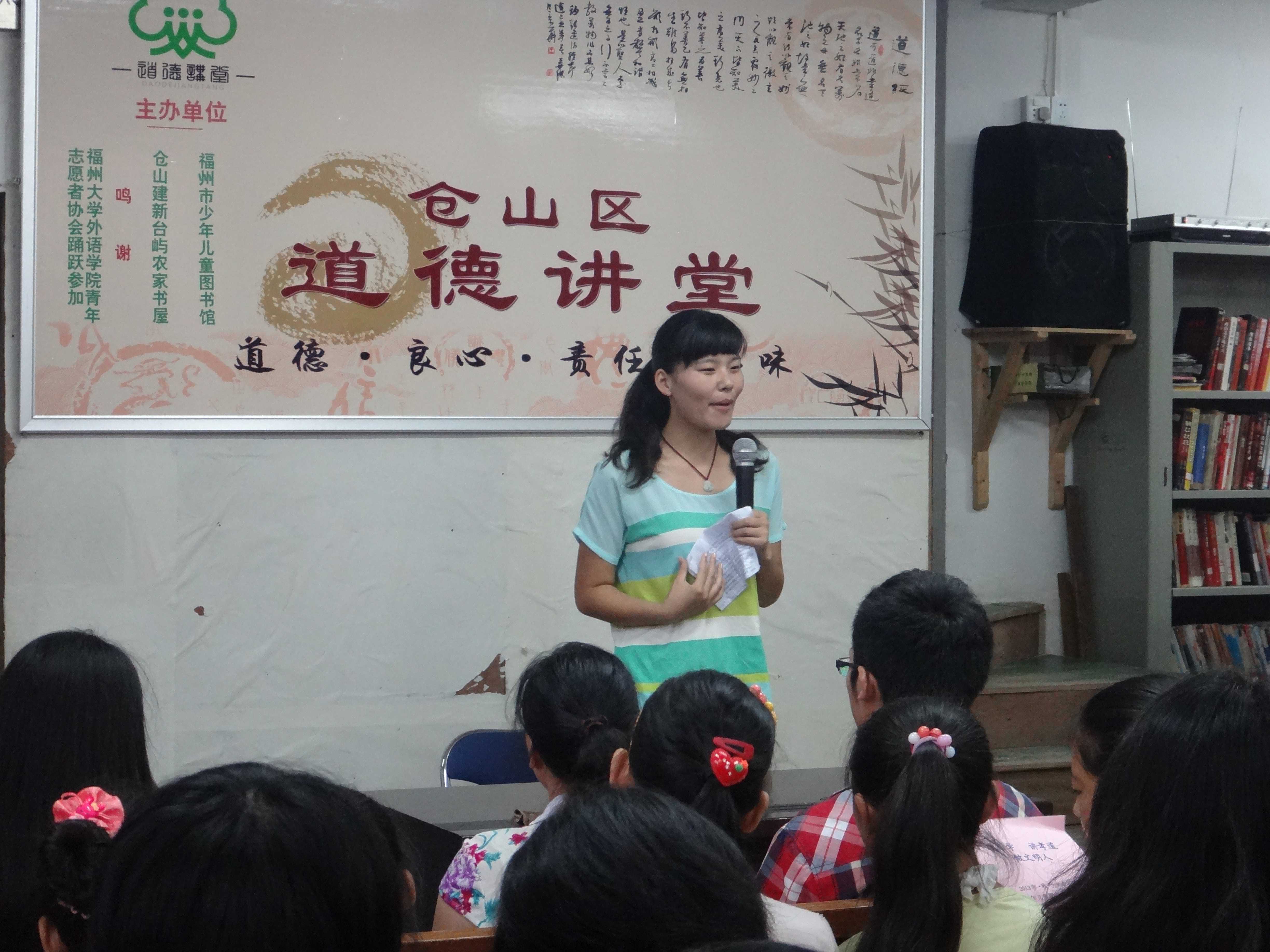 青年志愿者协会携手台屿村农家书屋,开展“学国学,讲孝道,做文明人” 为主题的道德讲堂活动。志愿者刘芸云首先做了主题为“传承孝道文化”的发言,使在场的同学们对于新世纪孝道美德的定义有了更加深刻的了解;接下来,一小女孩背诵《弟子规》,两名中学生代表讲述有关二十四孝的小故事,体现了传统文化以及美德在少年儿童中的传扬;而后,志愿者王路平进行的演讲及古稀老人的演奏将活动推向了高潮。一位乡镇领导干部对于青少年的道德以及修养的做了评价与期望,体现了老一辈的期望;最后,林家荣以一首《愚公移山》作为压轴节目,活动落下了帷幕。