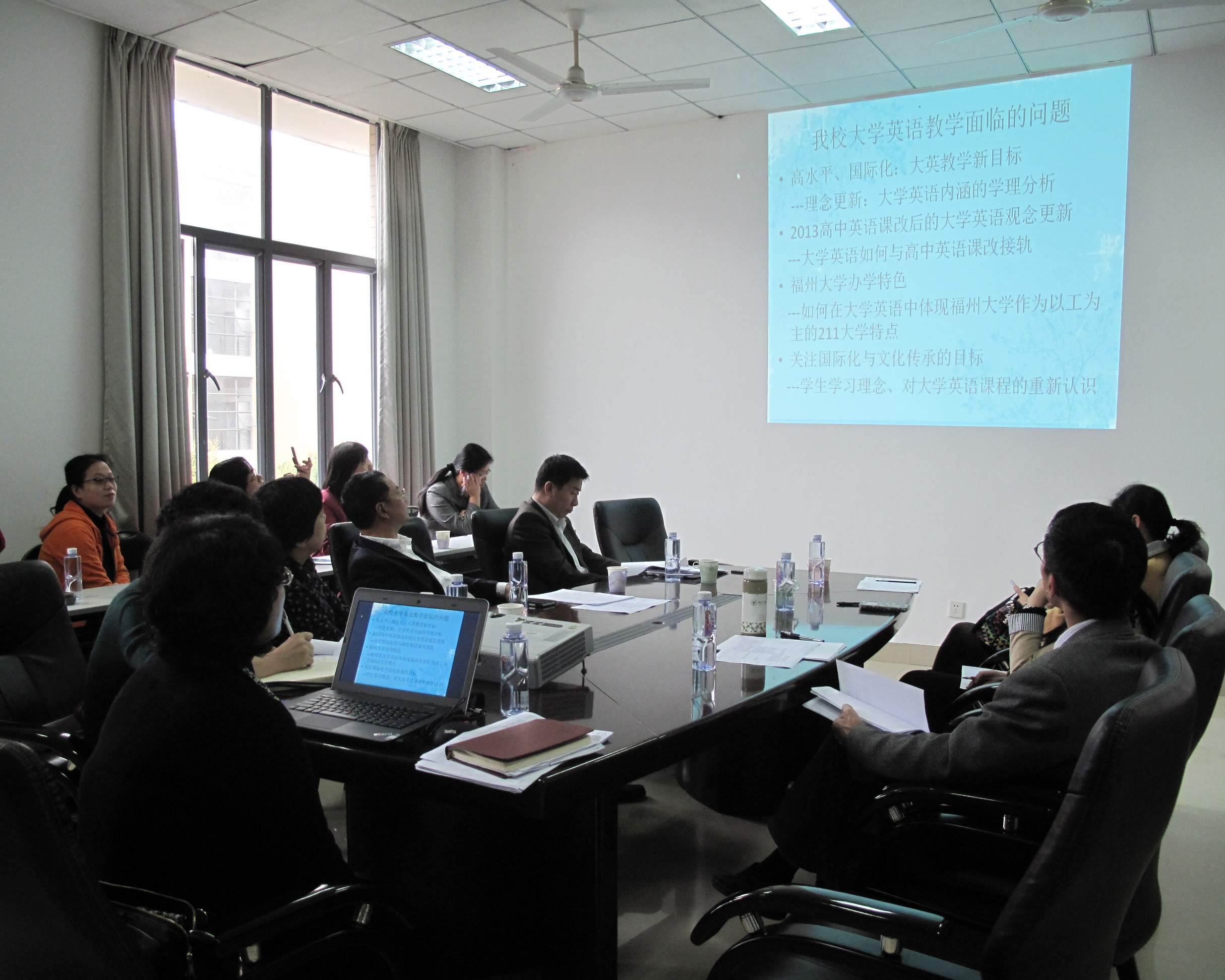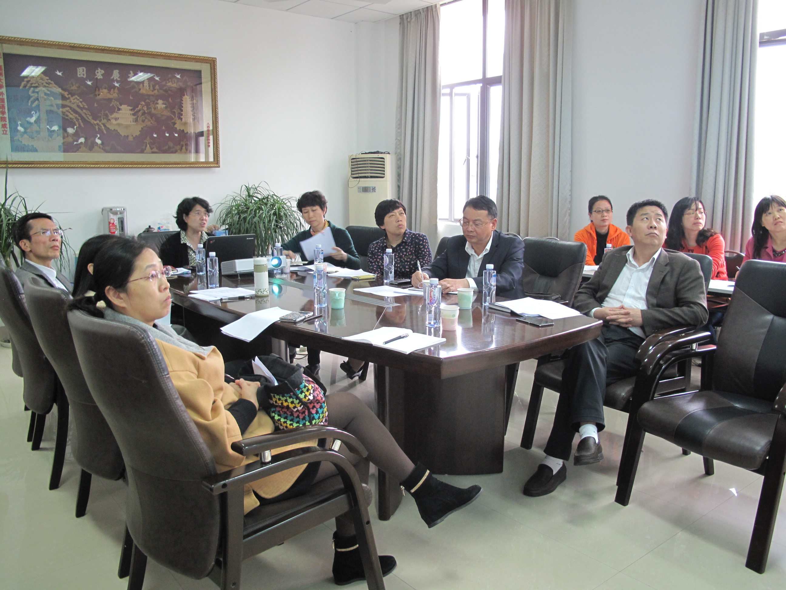 潘院长首先回溯了2015级大学英语培养方案制订前期所做的各项准备和各个层面的沟通工作,介绍了目前全国大学英语教学改革的学术理念及国内同类兄弟院校的教学改革动向和实施情况,然后就我校大学英语教学面临的问题进行了分析和总结。基于这些教改理念和我校大学英语教学的实际情况,潘院长提出了我校大学英语教学改革的思路和实施步骤,以及希望教务处领导予以帮助解决的问题。之后大学英语公共第一教研室主任苏蓉老师就2015级大学英语培养方案进行了详细的阐释说明。