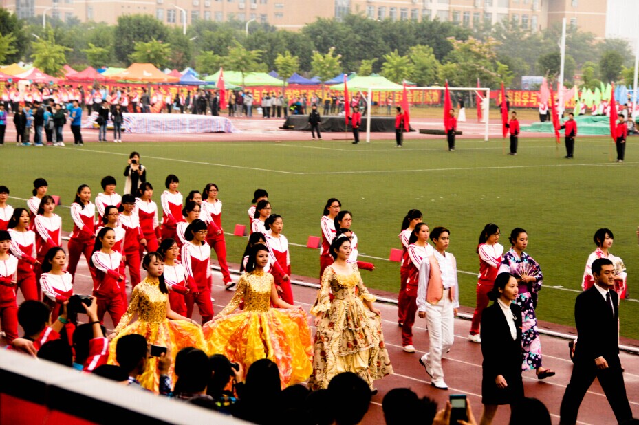 的队列方阵设计紧贴学院专业特色,队形变换上设计出德国奔驰品牌的标志,代表着他们奔驰向前、奋勇拼搏的精神;身着有英、日、德三国特色服装的同学在场上起舞,代表学院三个专业特色文化的展示。