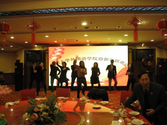 的外籍教师们也不甘示弱,日语系几位外教老师集体登台,一出名为《四大美人秀》的表演载歌载舞,令人莞尔。最后表演的学院全体工会干部,伴随着动感的音乐,他们跳起了目前红遍全球的《江南style》,炫酷的黑墨镜,经典的骑马舞造型,夸张的动作,让全场的气氛high到极点。最后学院倪朝兴党委书记和陈小慰院长分别致新年贺词,联欢会在温馨和谐的气氛中圆满结束。