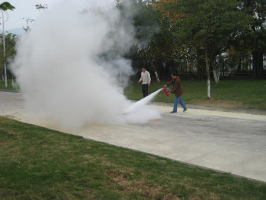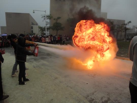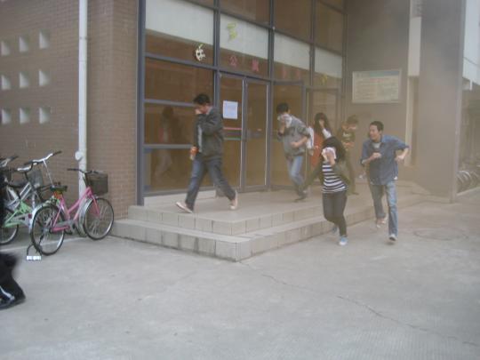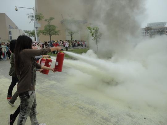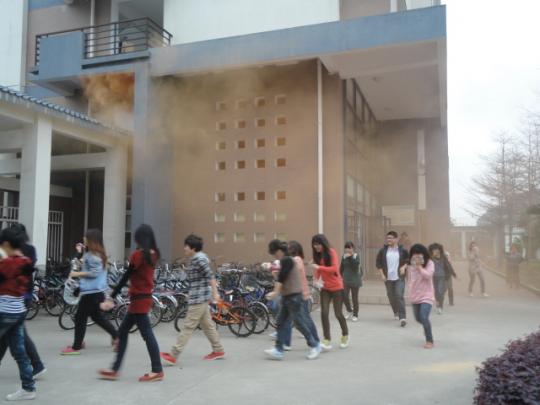 演练开始,学院准时启动紧急组织方案,演练人员在楼道点燃烟雾弹,顿时整个楼道烟雾弥漫,同学们用湿毛巾捂住口鼻,在辅导员、楼层学生负责人立的带领下,快速、有序、安全地撤离宿舍。整个撤离路线以先前安排好的为准,从宿舍楼到一区门口再到化工学院集合,各班按撤离路线撤离至指定地域,清点人数并上报辅导员。接下来,保卫部老师示范如何正确使用灭火器,同学们现场实践。虽然此时已是大雨倾盆,可同学们的热情却越见高涨,一组接着一组前去演练,此次演练使他们收获颇丰,也学会了如何应对紧急状况。