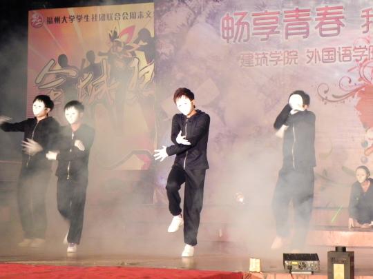 》中正式拉开序幕。晚会精彩纷呈,高潮迭起,现场气氛十分热烈。有风格迥异的现代舞串烧,轻快活泼的街舞,妩媚多姿的拉丁舞,让观众们大饱眼福;还有极具古朴气息的民乐合奏《菊花台》,将音乐与舞蹈相结合,为大家带来了一场听觉与视觉的双重盛宴;此外,搞笑山寨版《唐伯虎点秋香