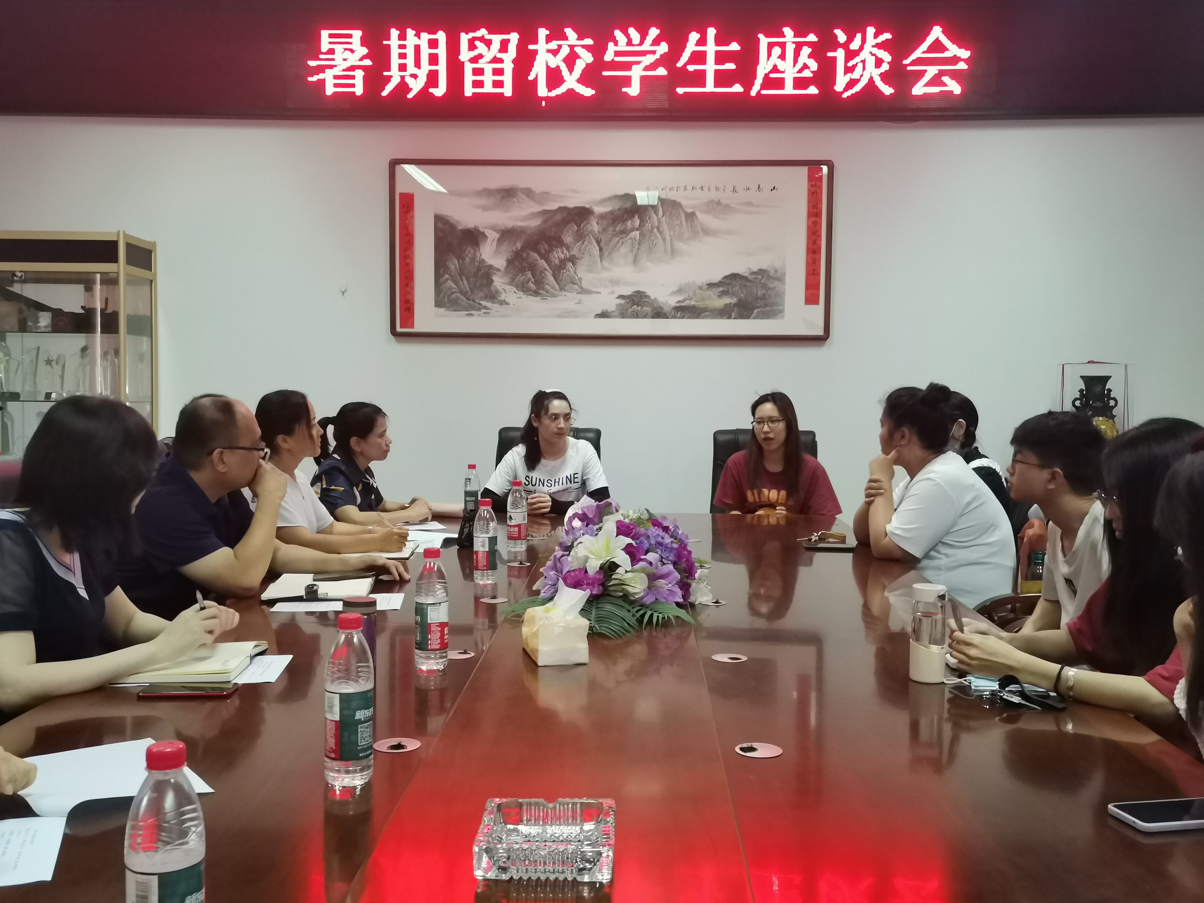 在208会议室召开了暑期留校学生座谈会。我院党委程贞玫副书记、王三强副书记、英日德各系主任和行政办老师代表学院慰问暑期留校考研学子。