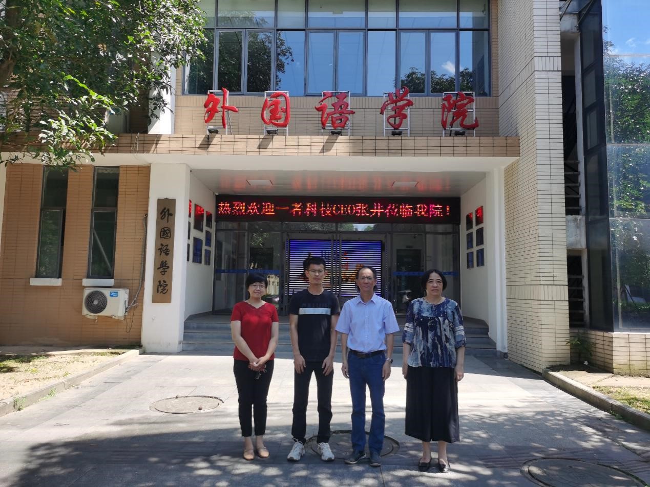 与上海一者信息科技有限公司签订实习实训基地共建协议。院长钟晓文、副院长林继红、翻译实践中心副主任叶颖及一者科技CEO张井出席签约仪式。