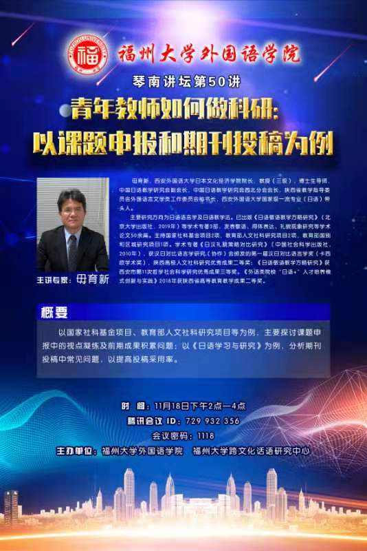 琴南讲坛嘉宾,讲座题目为《青年教师如何做科研:以课题申报和期刊投稿为例》。讲座由日语系系主任金玉花博士主持。