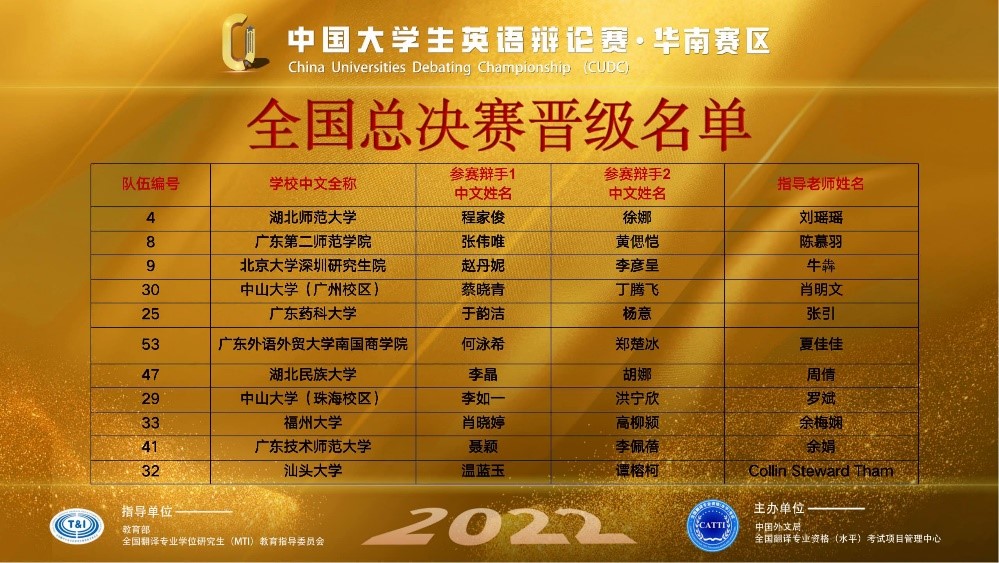 2022年9月24至25日,全国大学生英语辩论赛(China University Debating Championship CUDC)华南区比赛于线上举行。在指导老师余梅娴的带领下,英语系2019级学生高柳颍和肖晓婷经过5轮循环赛获得华南区赛二等奖,顺利晋级全国总决赛。