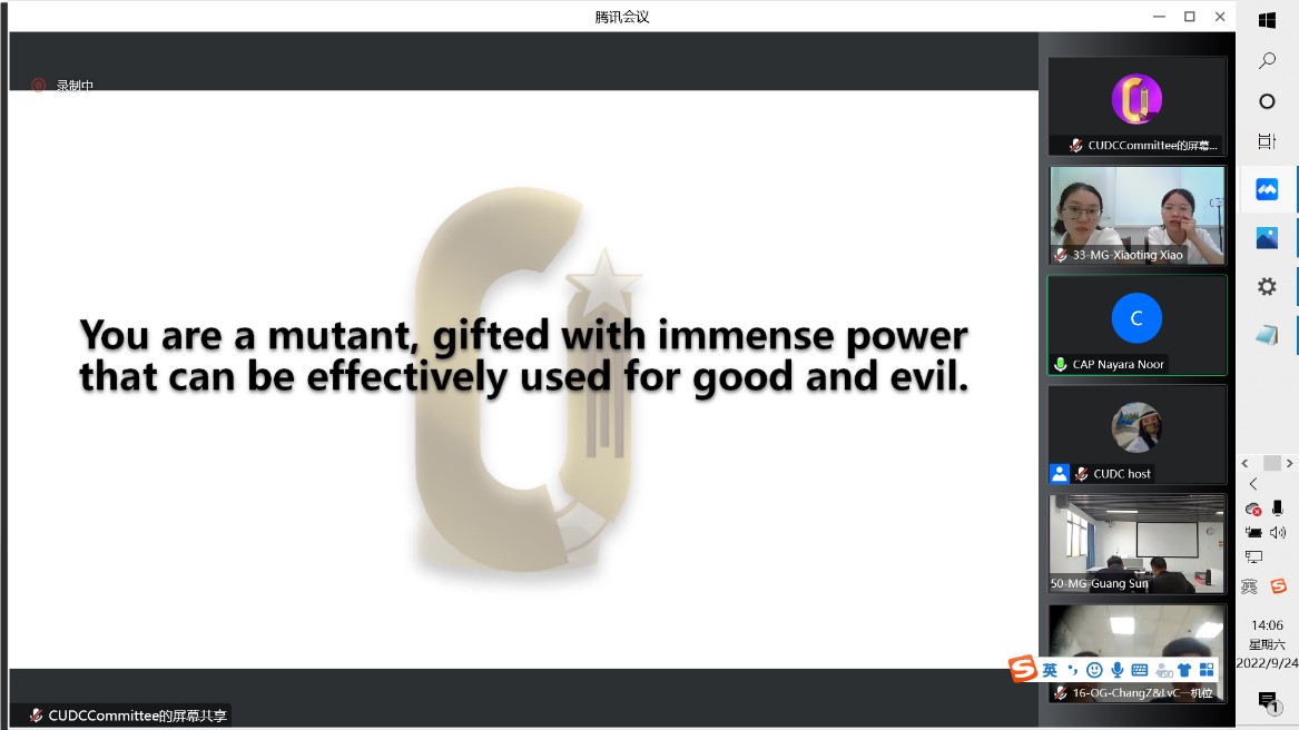 CUDC是由教育部全国翻译专业学位教育指导委员会指导、中国外文局全国翻译专业资格考试项目管理中心主办的全国大学生英语辩论赛。此次华南赛区比赛一共有来自香港、澳门、广东、广西、海南、湖南、湖北、福建、江西的60支队伍参加。CUDC辩论赛采用英国议会制辩论模式,每两位辩手组成一支队伍,正反方各两支队伍,分为上院和下院。辩题在比赛前15分钟公布,辩手不能借助任何电子设备查阅资料,必须自主地完成准备和比赛。
