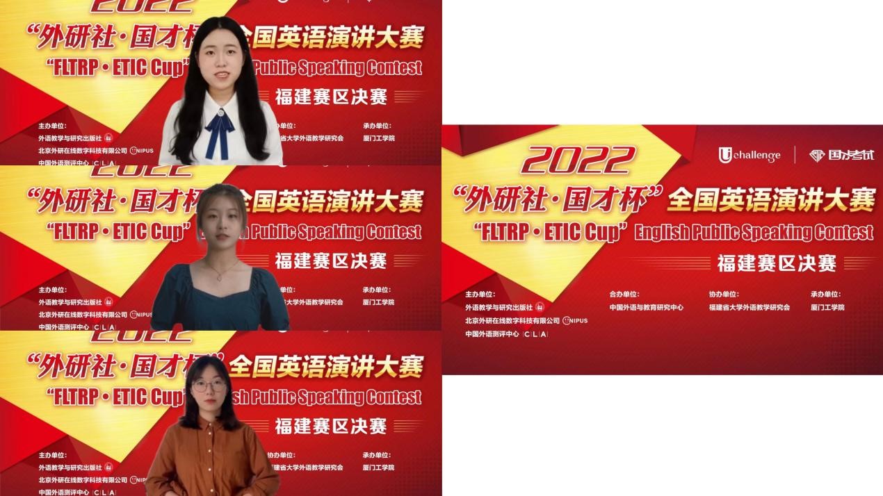 11月13日,2022“外研社·国才杯”全国英语演讲大赛福建赛区决赛在全省各高校同步进行。今年因疫情原因,比赛在线上进行。外语学院三位同学组成的电影天堂