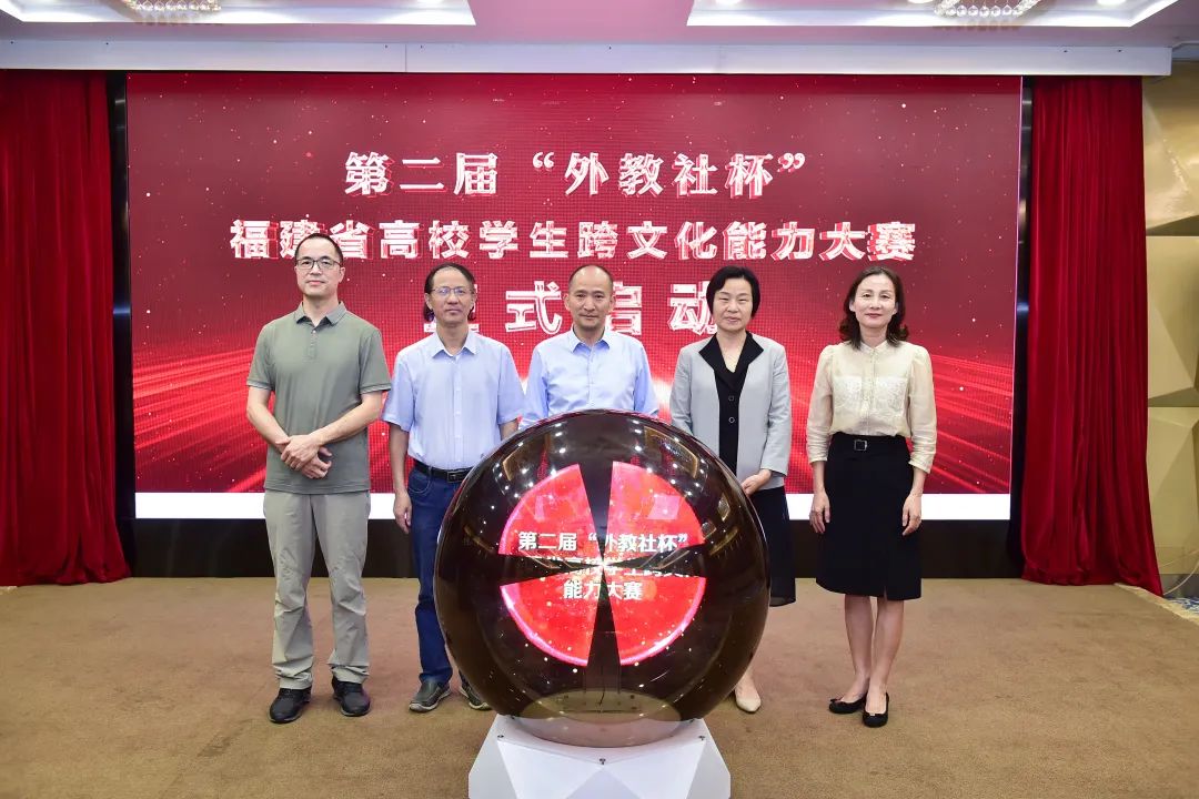 院长钟晓文教授,上海外语教育出版社叶青副社长共同上台点亮了启动球,第二届“外教社杯”福建省高校学生跨文化能力大赛正式开启。第二届“外教社杯”福建省高校学生跨文化能力大赛由福建省教育厅主办,福建师范大学、上海外语教育出版社承办,并由福建省外国语文学会、福建省大学外语教学研究会以及电影天堂