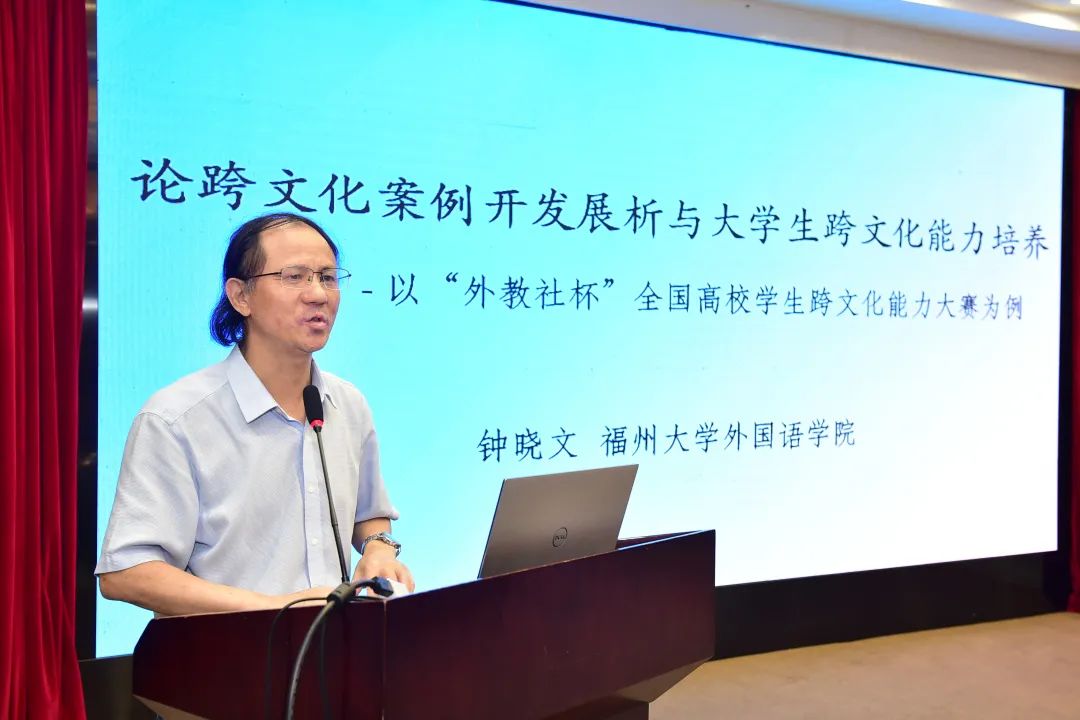 院长钟晓文教授作为首届福建省高校学生跨文化能力大赛评委主席、第五届全国高校学生跨文化能力大赛国赛评委,做了题为“论跨文化案例开发与新时期高校学生跨文化能力培养——以‘外教社杯’全国高校学生跨文化能力大赛为例”的报告。他在报告中指出在新时期高校学生跨文化能力培养中,案例开发具有重要意义。跨文化案例的开发设计与呈现表演,在高校学生跨文化能力培养教学中,往往以其生动形象之语境场景再现,突破传统课堂讲授型为主教学之束缚,参与学生在“身临其境”中既培养了跨文化意识,亦在实践上提升了跨文化能力。