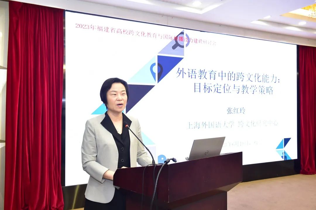 在下午举行的第二届“外教社杯”福建省高校学生跨文化能力大赛启动仪式上,上海外国语大学跨文化研究中心主任张红玲教授,福建省大学外语教学研究会副会长、福建商学院外语学院院长池玫教授,福建省外国语文学会秘书长、福建师范大学电影天堂