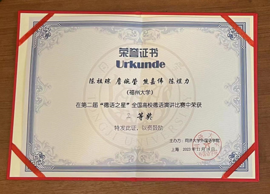 2023年11月18日,第二届“德语之星”全国高校德语演讲比赛决赛落下落幕。由德语系20级陈祖琼、20级詹婉莹、21级熊嘉伟和22级陈煜力组成的团队表现出色,荣获全国三等奖。