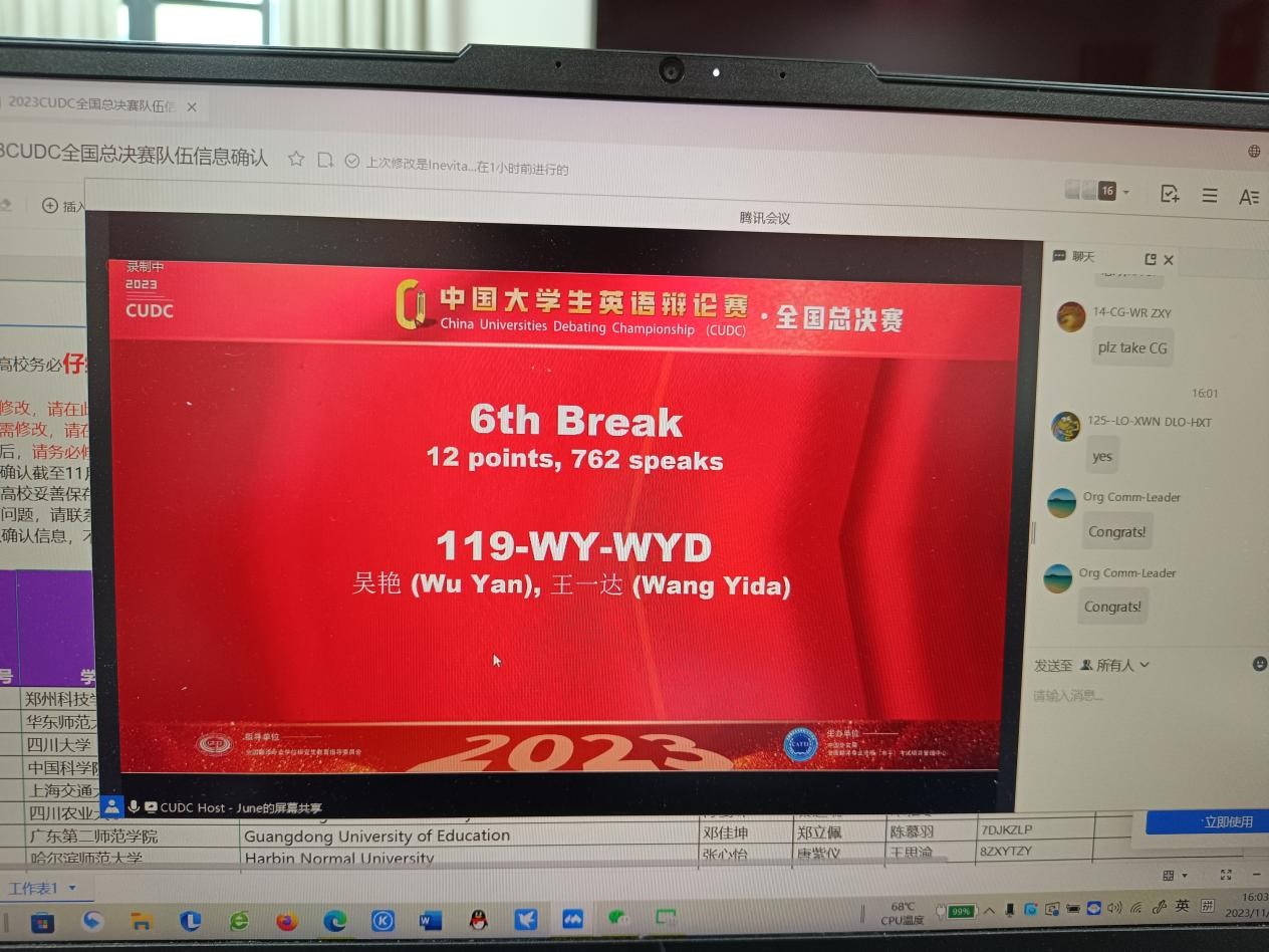 在2023年11月11-12日和11月25日三天期间,中国大学生英语辩论赛(China University Debating Championship CUDC)全国总决赛在线上举行。在指导老师余梅娴的带领下,由英语专业2020级学生吴艳和2021级学生王一达组成的电影天堂