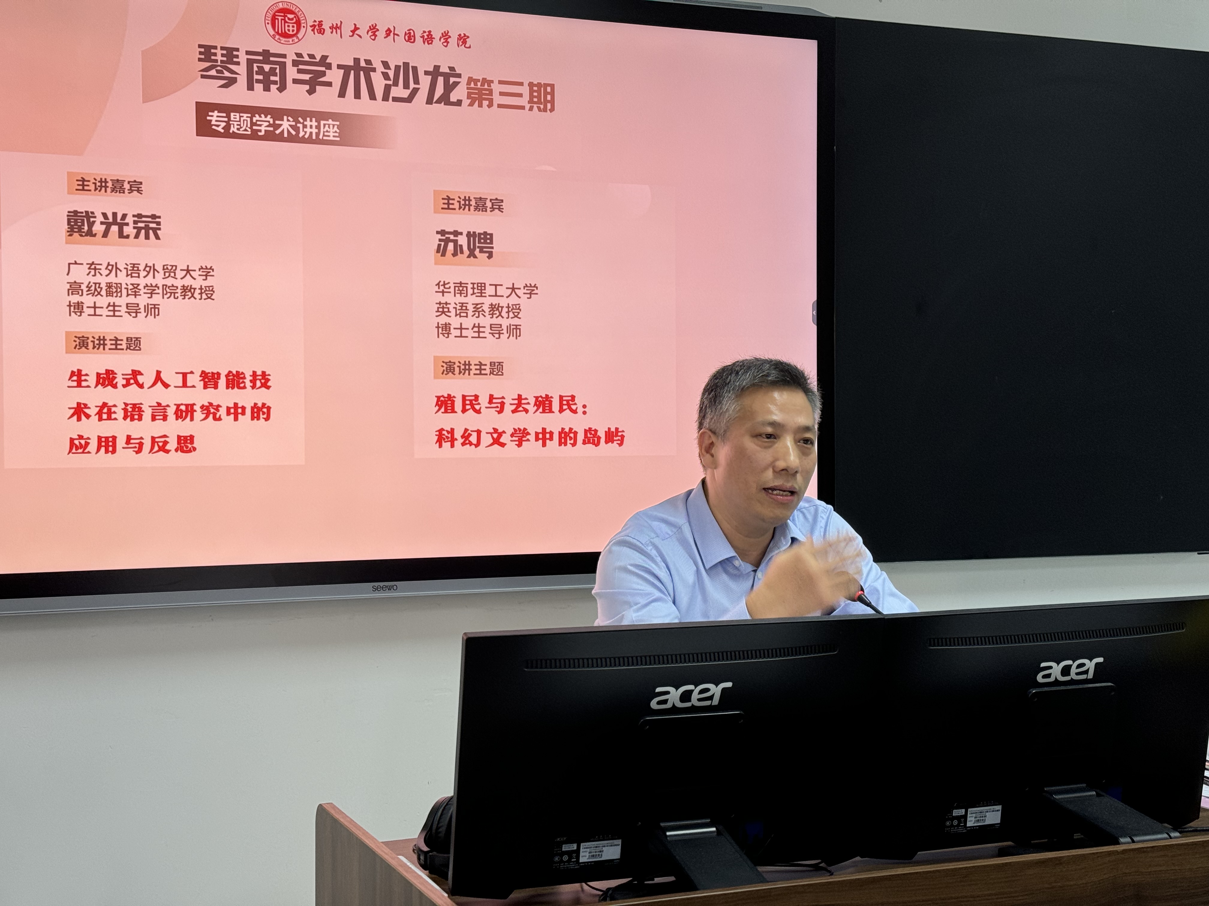 第二位演讲者是广东外语外贸大学高级翻译学院博士生导师戴光荣教授,他的主题是《生成式人工智能技术在语言研究中的应用与反思》。戴教授首先向大家介绍了生成式人工智能的定义。生成式人工智能是人工智能模型和技术当中的一种,它会根据使用者输入的数据生成新数据,而新数据的风格与内容与输入数据相似。紧接着,戴教授谈到了生成式人工智能在生物医学等专业领域的应用。他谈道,生成式人工智能已经拥有简单的意识,它在社会上也引发了一些争议。有些人持肯定态度,认为它大有可为,有些人持否定态度,担忧它对人脑的取代。外语学科的从业者们也提出了疑问:我们的研究领域是否会受到人工智能的侵占?我们的工作是否会被Chat-GPT等应用所取代?
