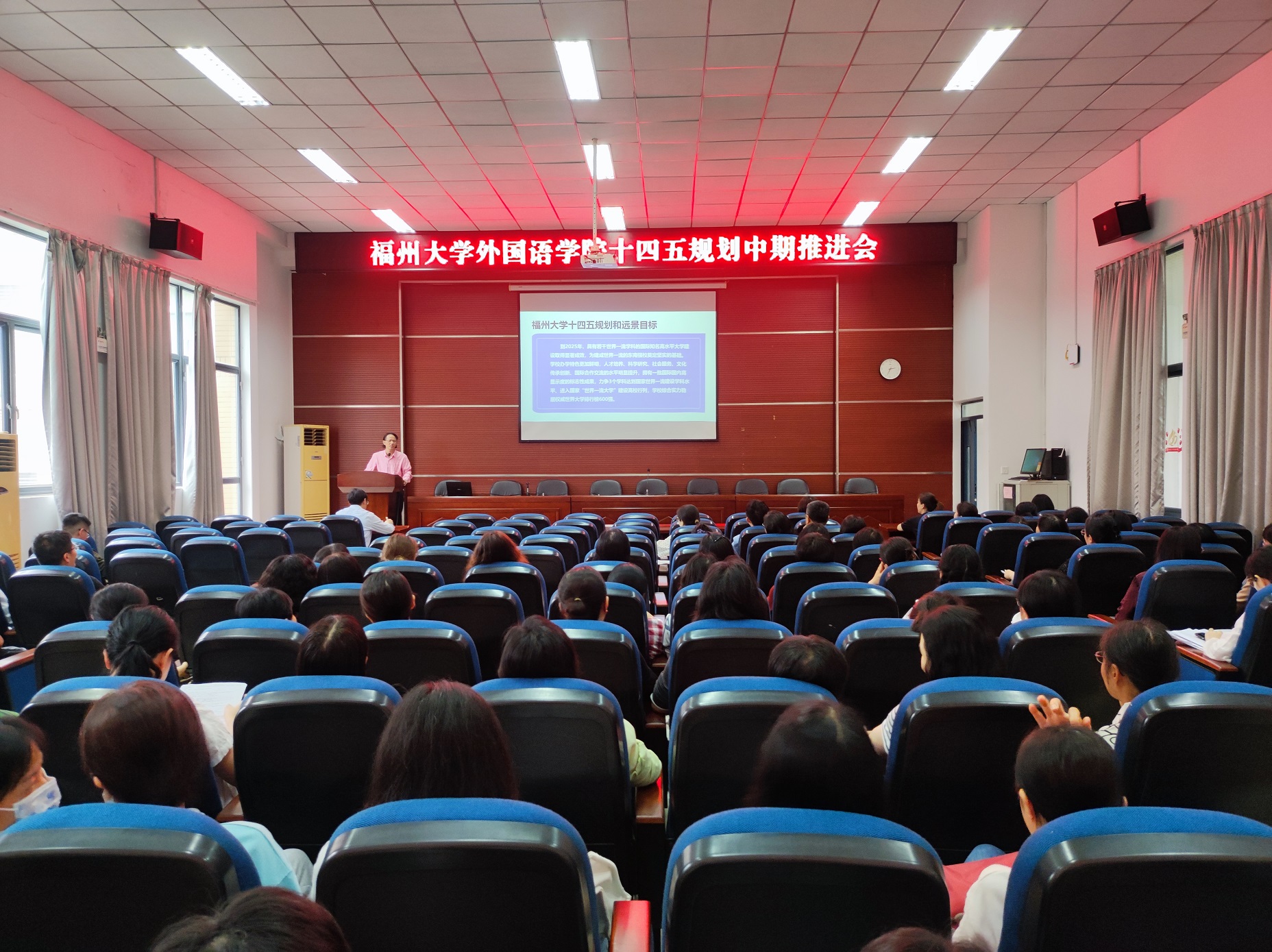 会上,钟晓文院长就学校十四五规划和远景目标、“11个一流”、“1445”战略工程等具体内容进行详细解读,对学院十四五规划和“一号工程”的中期进展情况进行了汇报,并对学院十四五规划部分具体量化指标的调整意见进行说明。他表示,全院教职工要以教育教学思想和综合改革大讨论为契机,做好十四五规划和“一号工程”的后半篇文章,要继续推进党建工作与学院中心工作深度融合,加强国际传播和思政课程建设;继续加大人才引进力度,着力解决学院目前面临的人才断层危机;对标对表申报外语博士点的新要求,尽早筹划整合,争取冲刺外语学科博士点。