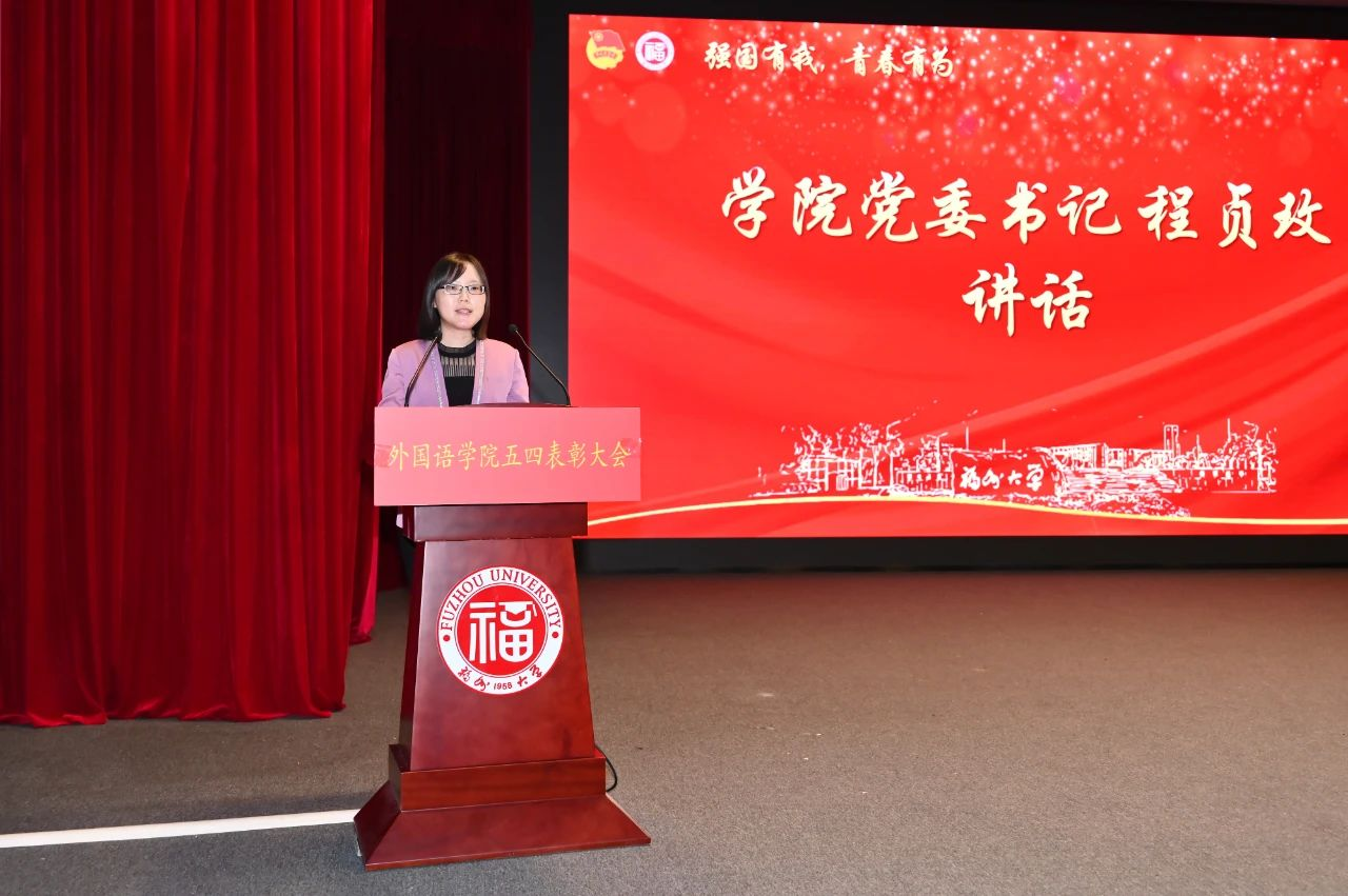 学院党委书记程贞玫发表讲话。她对全院各级团学组织和广大青年致以节日问候,向受到表彰的先进集体和个人表示热烈的祝贺,向长期以来关心外院学子成长、致力于教育事业的嘉宾领导们、老师们表示衷心的感谢。她回顾了电影天堂