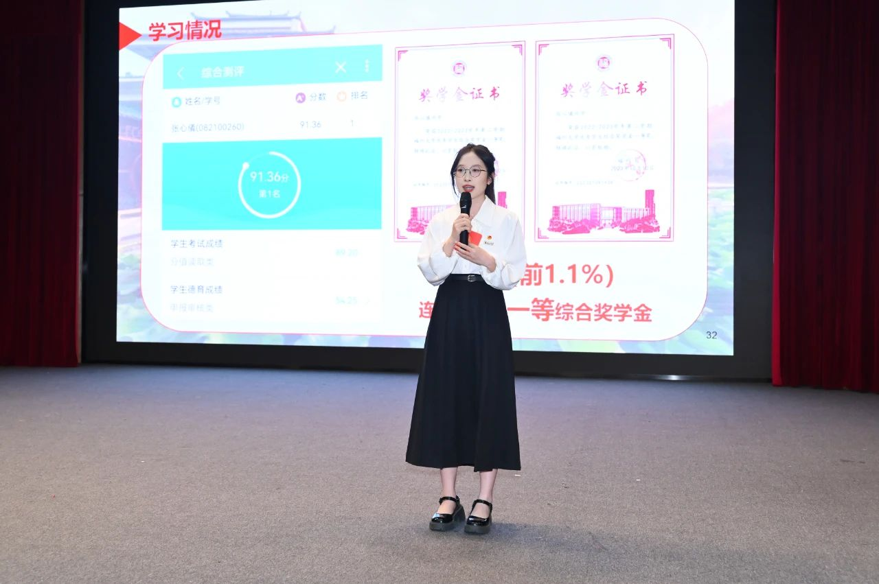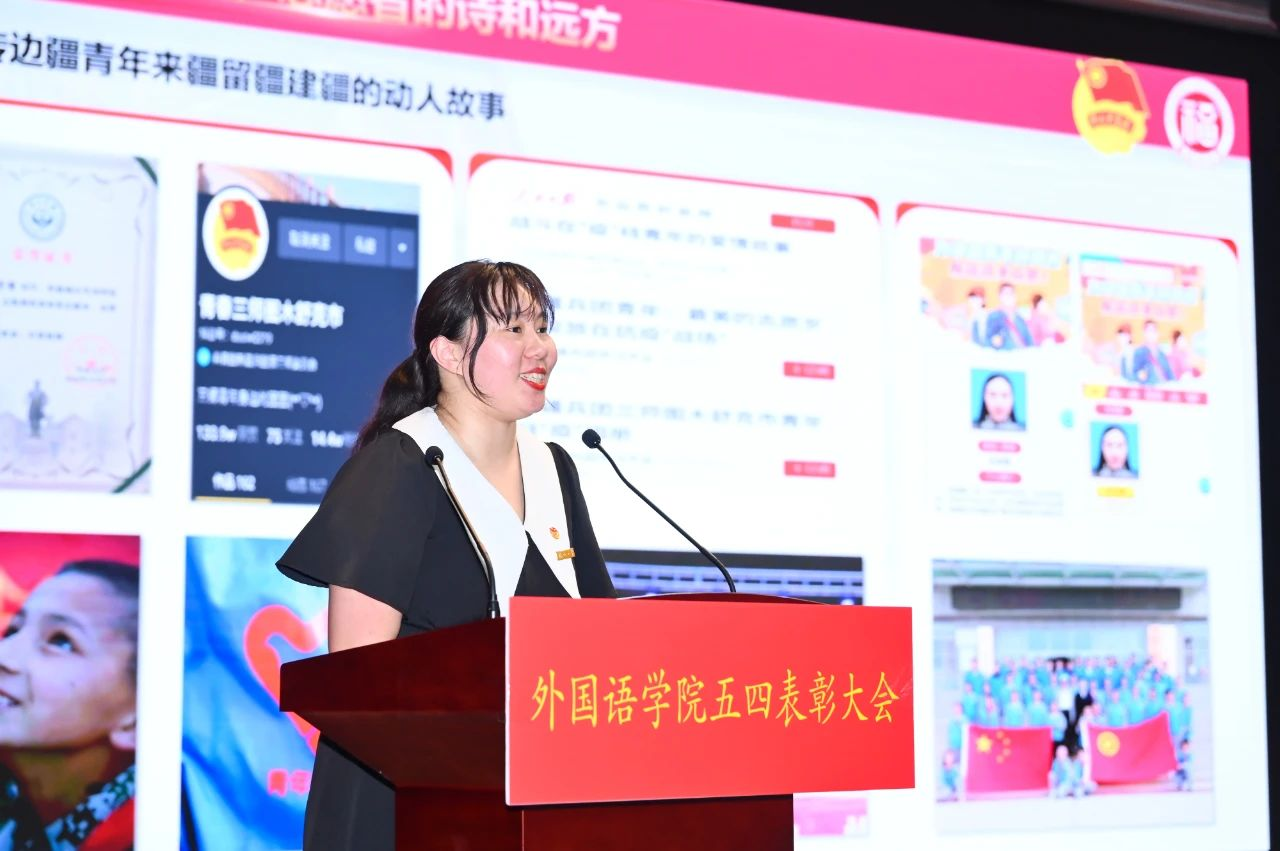颁奖仪式后,校十佳大学生获得者张誉馨进行青春宣讲。张誉馨同学分享了她的逐梦历程。作为“感动新疆十大网络人物”之一,她积极投身援疆志愿,在祖国的边疆发光发热;作为外语追梦人,她仰望星空,笃定追寻科研之路。她不仅个人学业成绩优异,在学生工作方面也有出彩表现:创新工作内容,开设多个活动项目,为营造良好的校园学术环境献力献策。