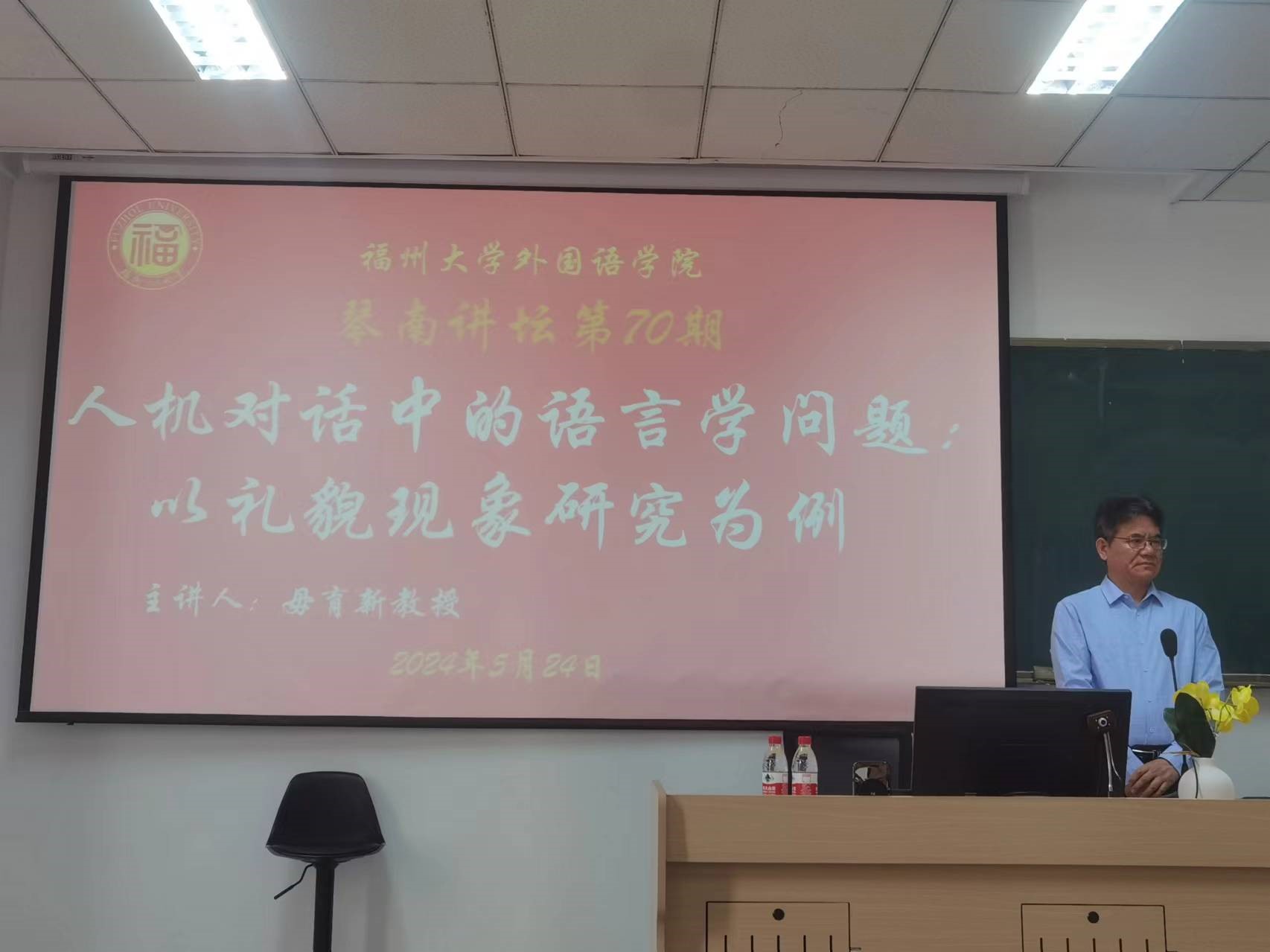 “琴南讲坛”,讲座题目为《人机对话中的语言学问题——以礼貌现象研究为例》。毋育新教授现任西安外国语大学研究生院院长兼日本文化经济学院院长,博士生导师,兼任汉日对比语言学研究会会长、中国日语教学研究会常务副会长、陕西省高等学校教学指导委员会外国语言文学类工作委员会秘书长等职。