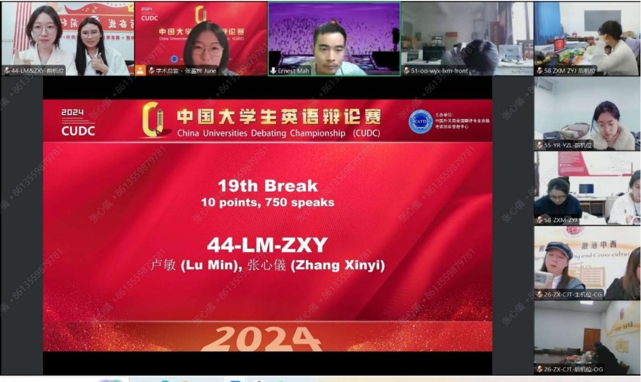 CUDC辩论赛是由全国翻译专业学位研究生教育指导委员会指导,中国外文局CATTI项目管理中心主办的一项重要赛事。比赛期间,卢敏与张心儀同学展现了卓越的团队协作能力,相互配合,彼此支持,在老师的鼓励与指导下共同应对挑战,充分展现了电影天堂 学子在思辨能力与语言表达方面的综合实力。