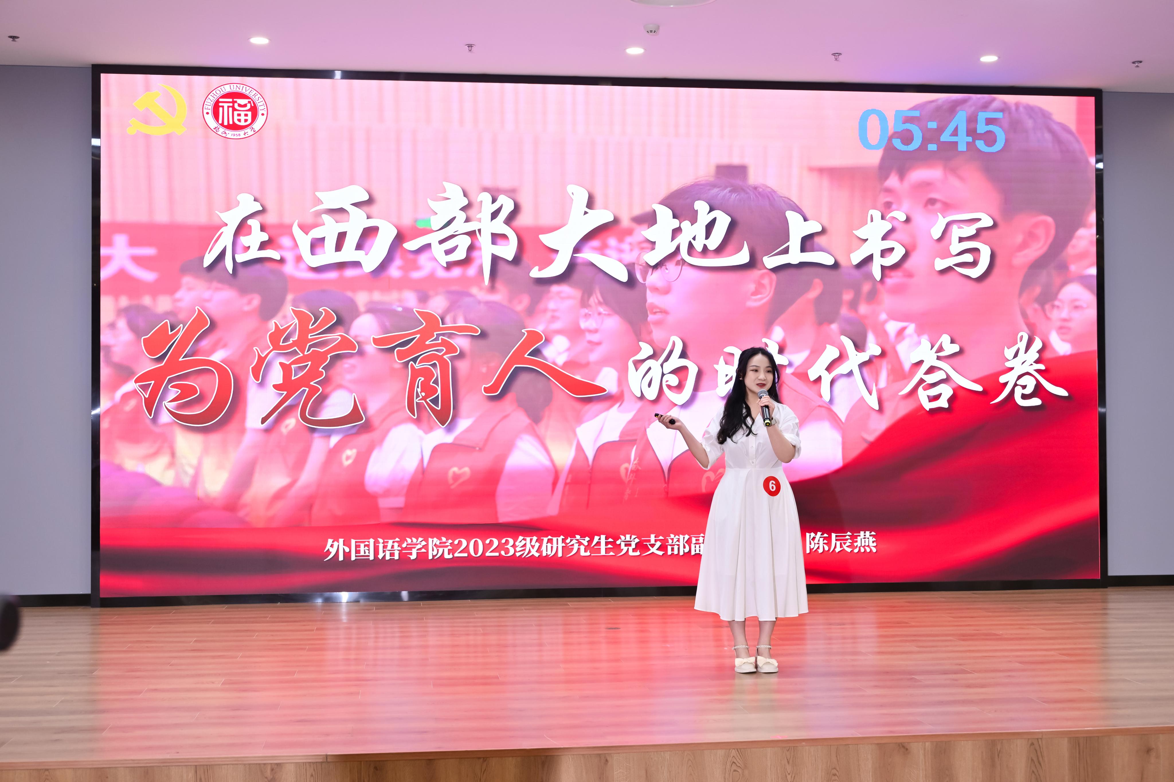 陈辰燕以《在西部大地上书写“为党育人”的时代答卷》为主题展开微党课。她结合自身思考与支教实践,以西部教育帮扶为切入点,阐述了在教育强国建设的新征程上,面对“区域教育不平衡”“民族地区教育发展滞后”等时代课题时,福大何为、福大人何为?同时,明确了新时代青年接力奋斗的努力方向,呼吁大家坚定理想信念、厚植家国情怀、练就过硬本领,积极响应习近平总书记号召,到祖国和人民最需要的地方发光发热,为中国式现代化建设贡献青春力量。